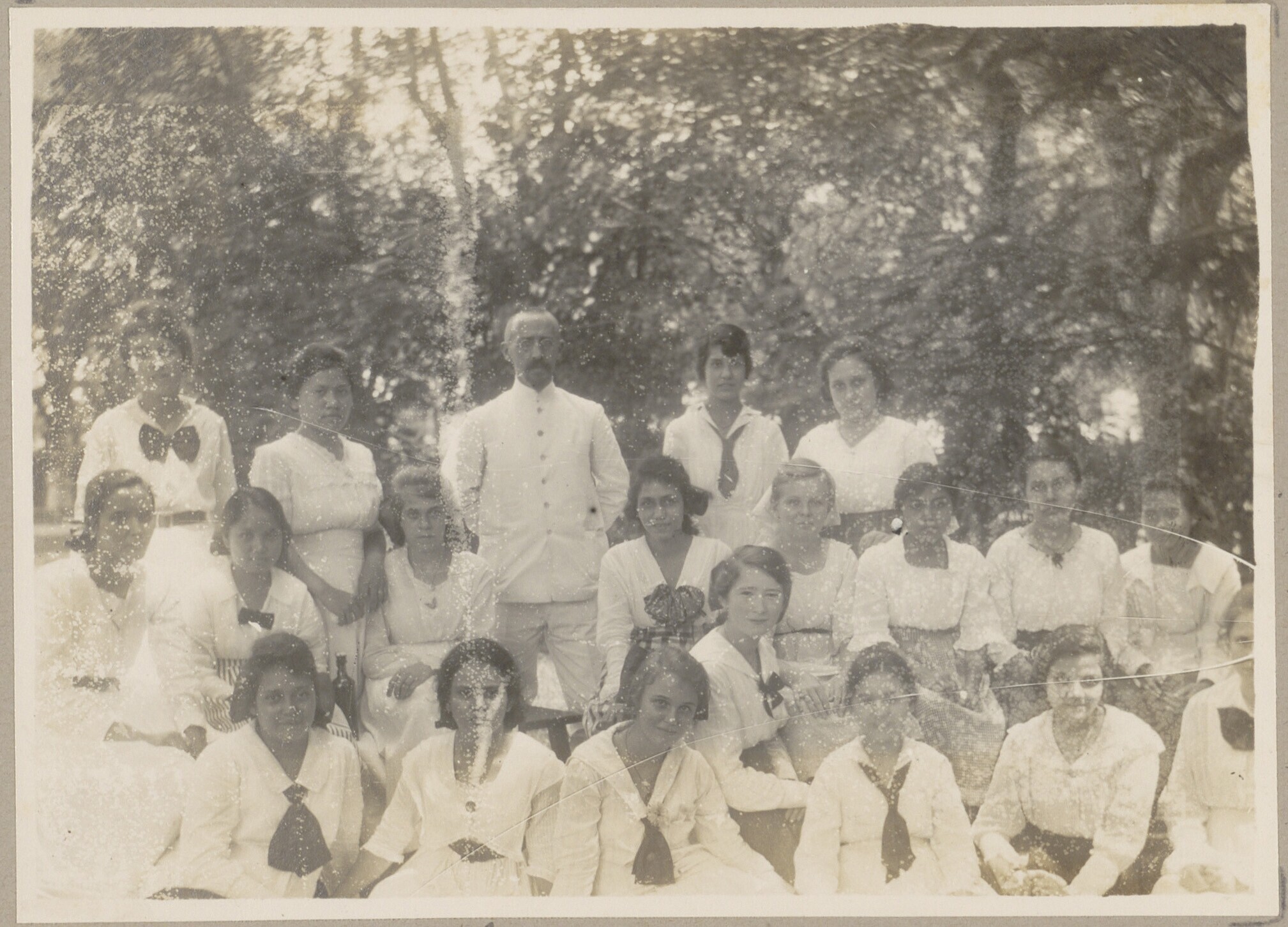 Portret van gezelschap vrouwen en een man
