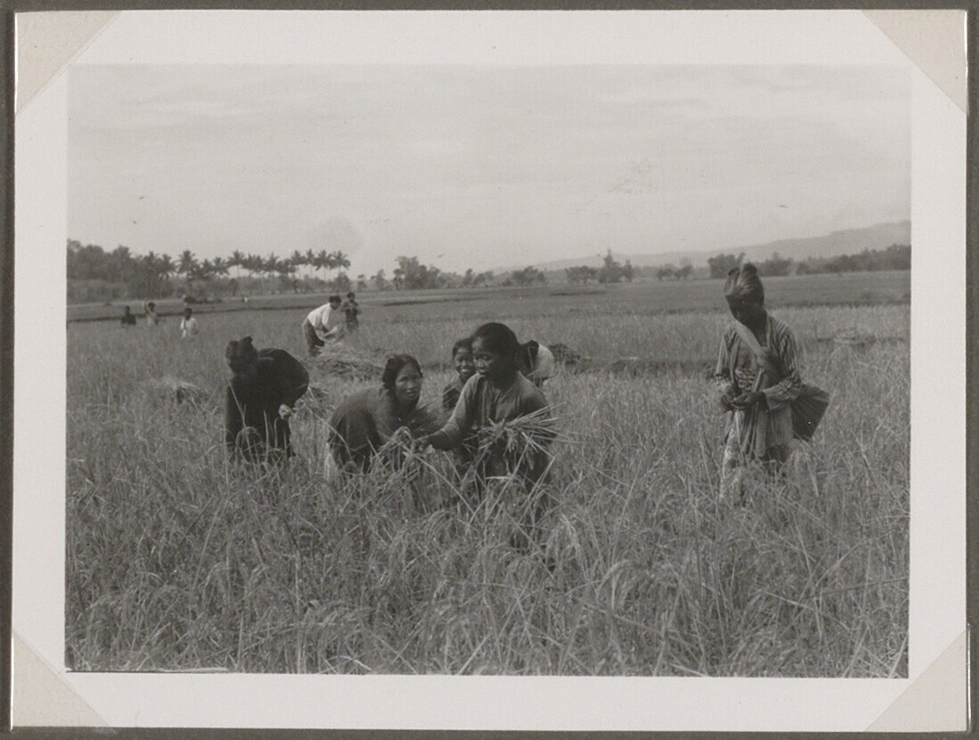 Vrouwen oogsten de rijsthalmen