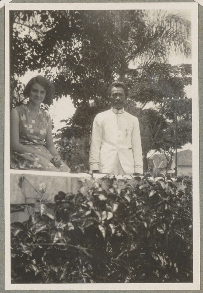 Man en vrouw op terras van pension Lux Vincit te Bandung