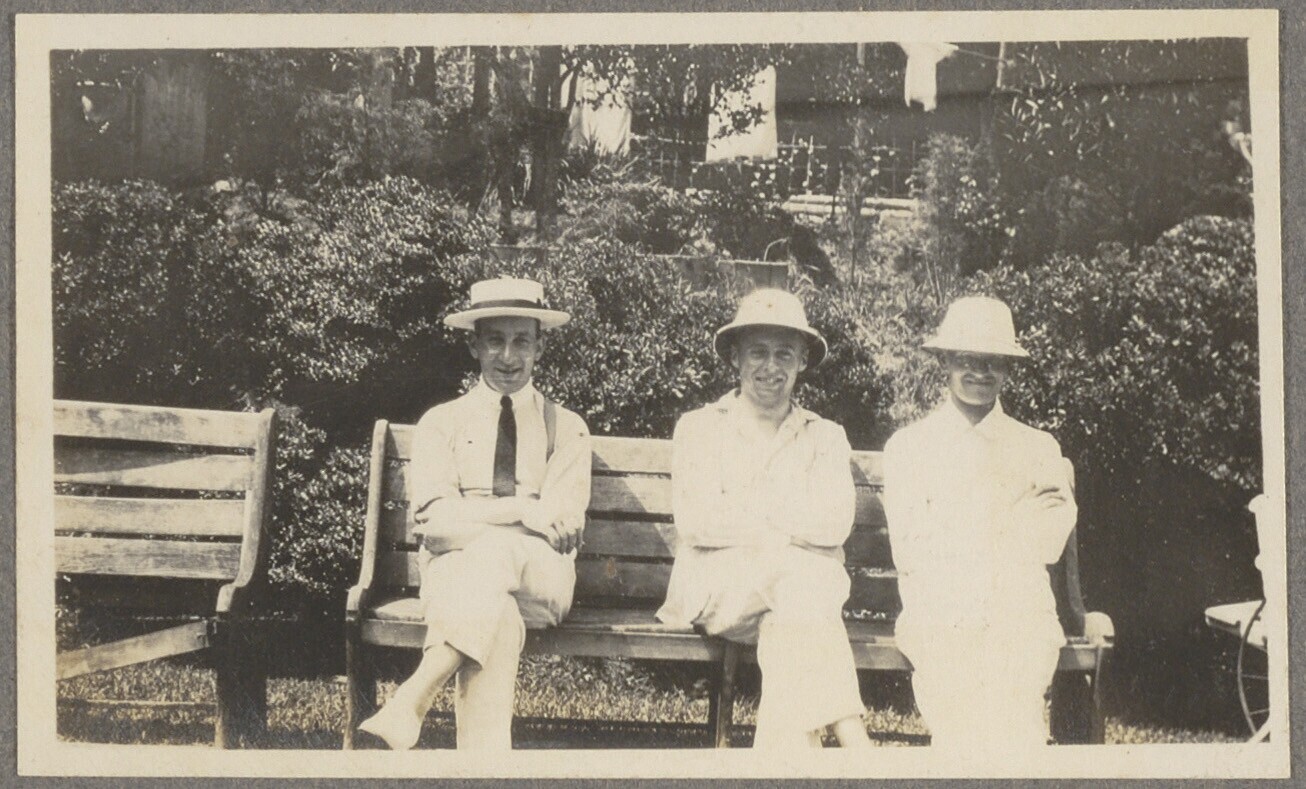 Drie mannen op een bank in een park in Suma, Japan