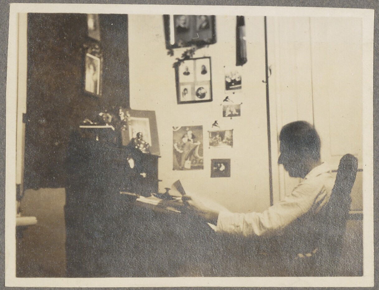 Man achter een bureau in Suma, Japan