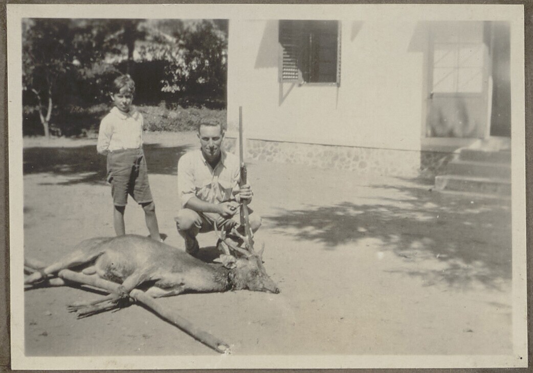 Jongen, man met geweer en neergeschoten hert