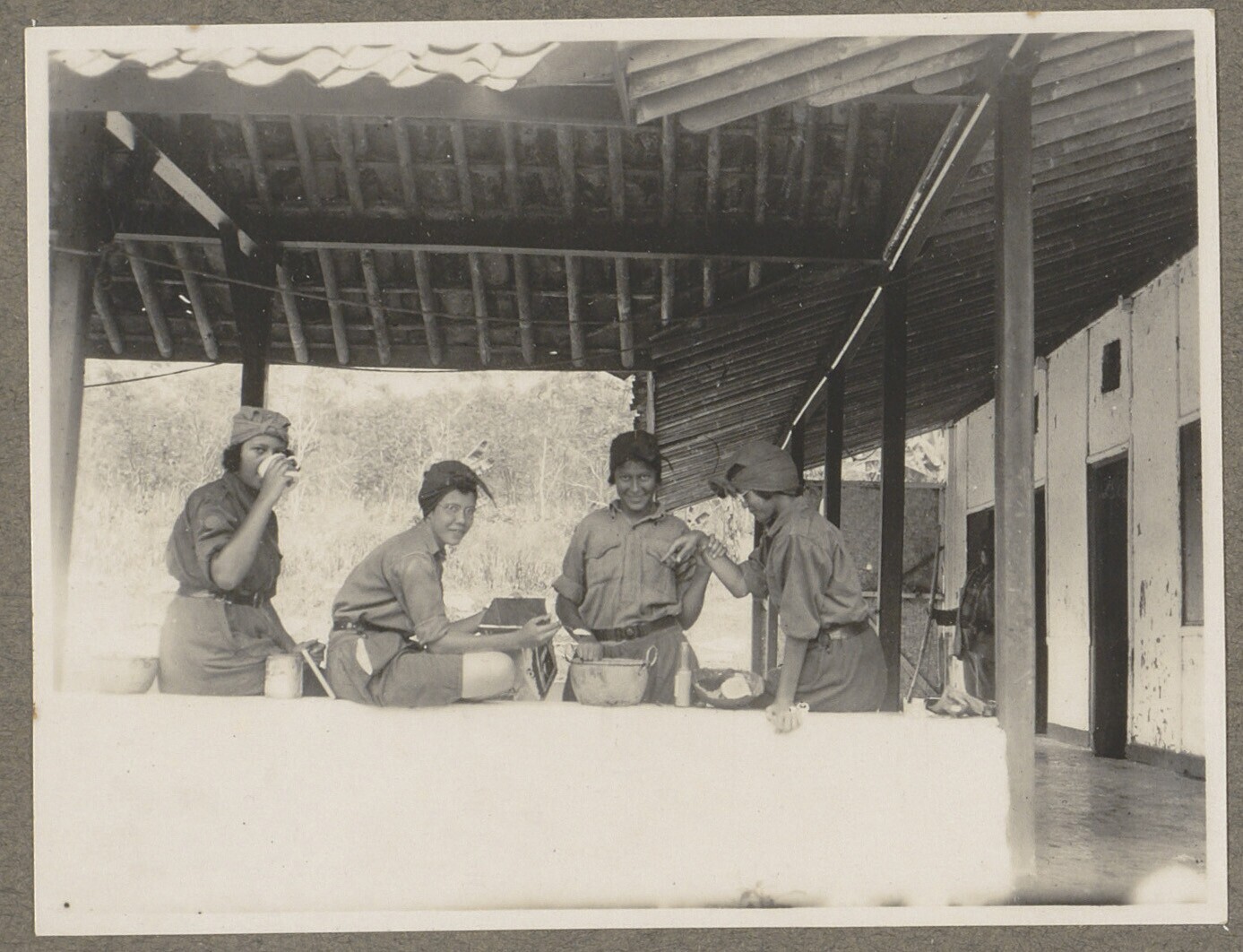 Vier meisjes in een schuur in padvinderskamp in Tjiomas, West-Java