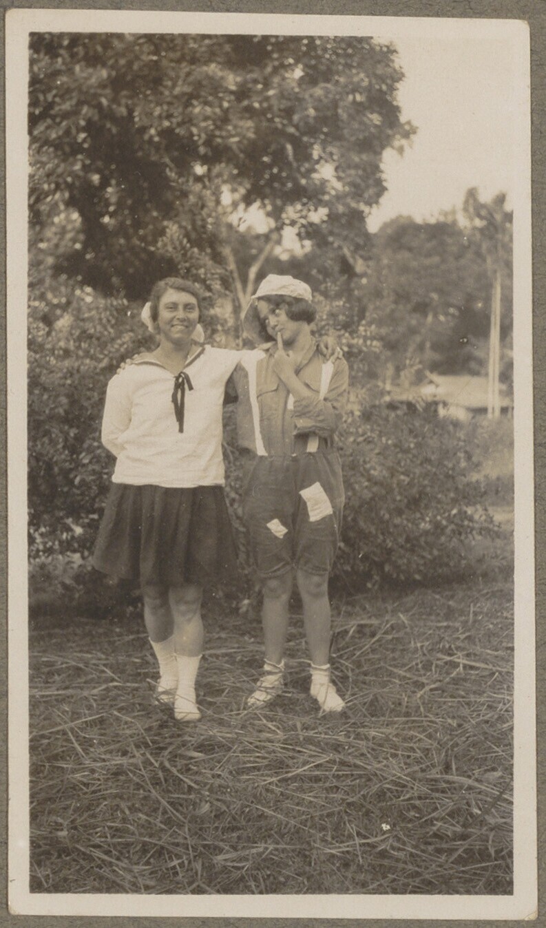Twee meisjes in padvinderskamp in Tjiomas, West-Java