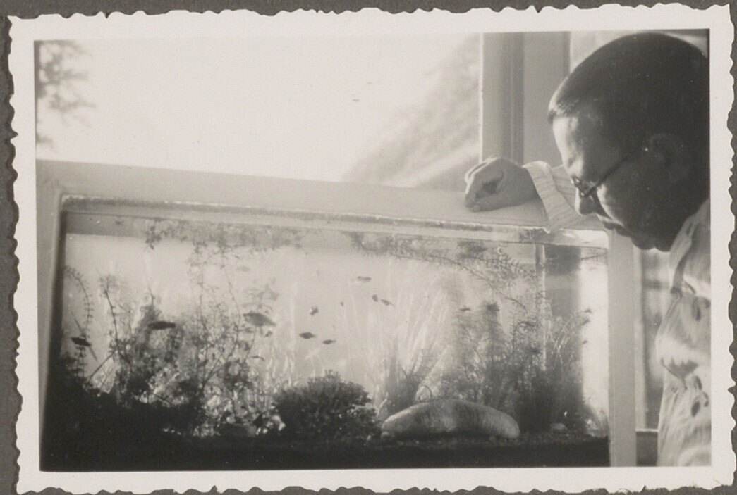 Portret van Resident Rookmaaker kijkend naar zijn vissen in het aquarium