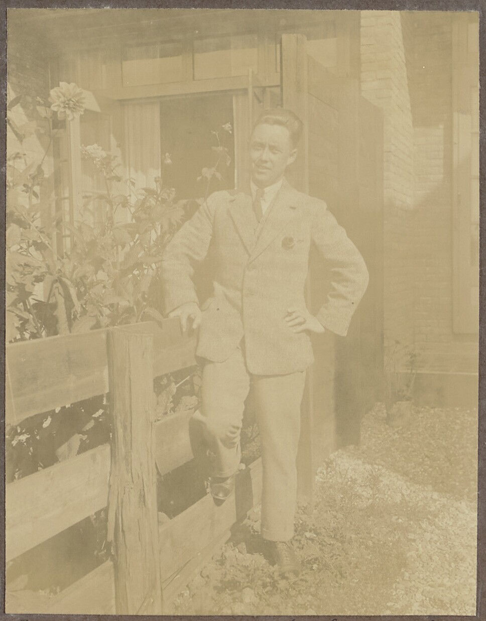 Portret van een Nederlandse man in een tuin te Katwijk