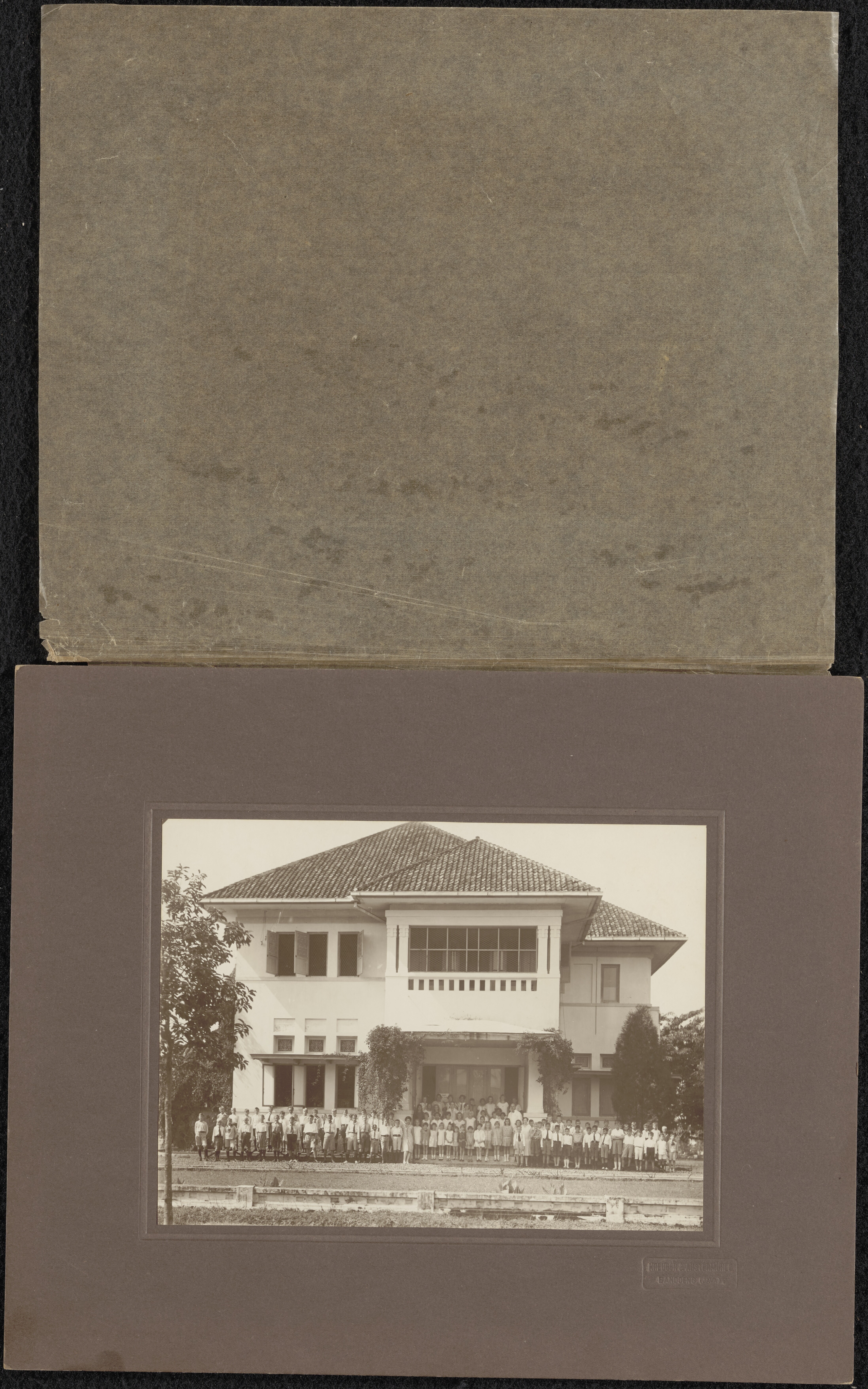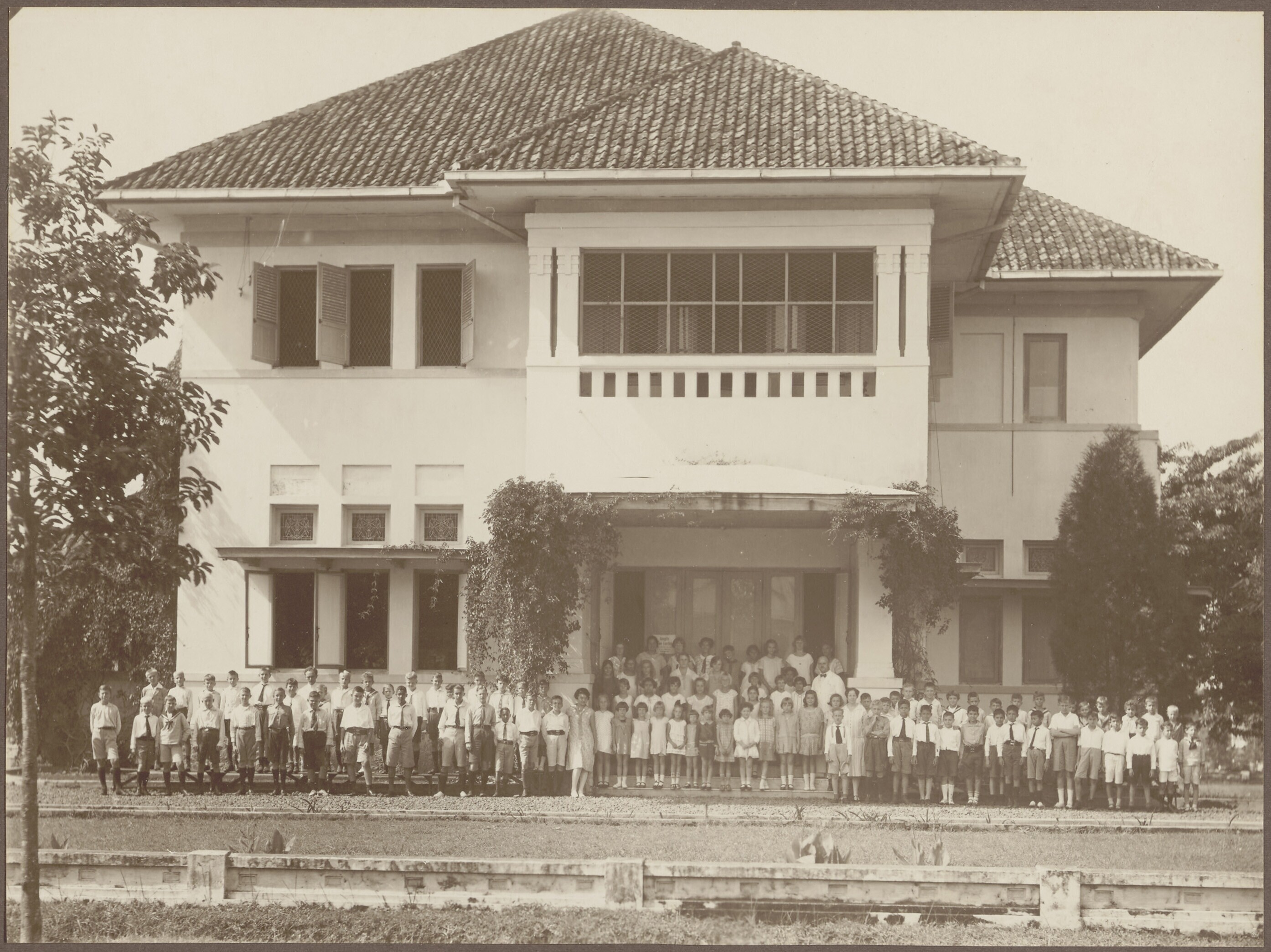 Schoolgebouw waarvoor leerlingen en leraren poseren