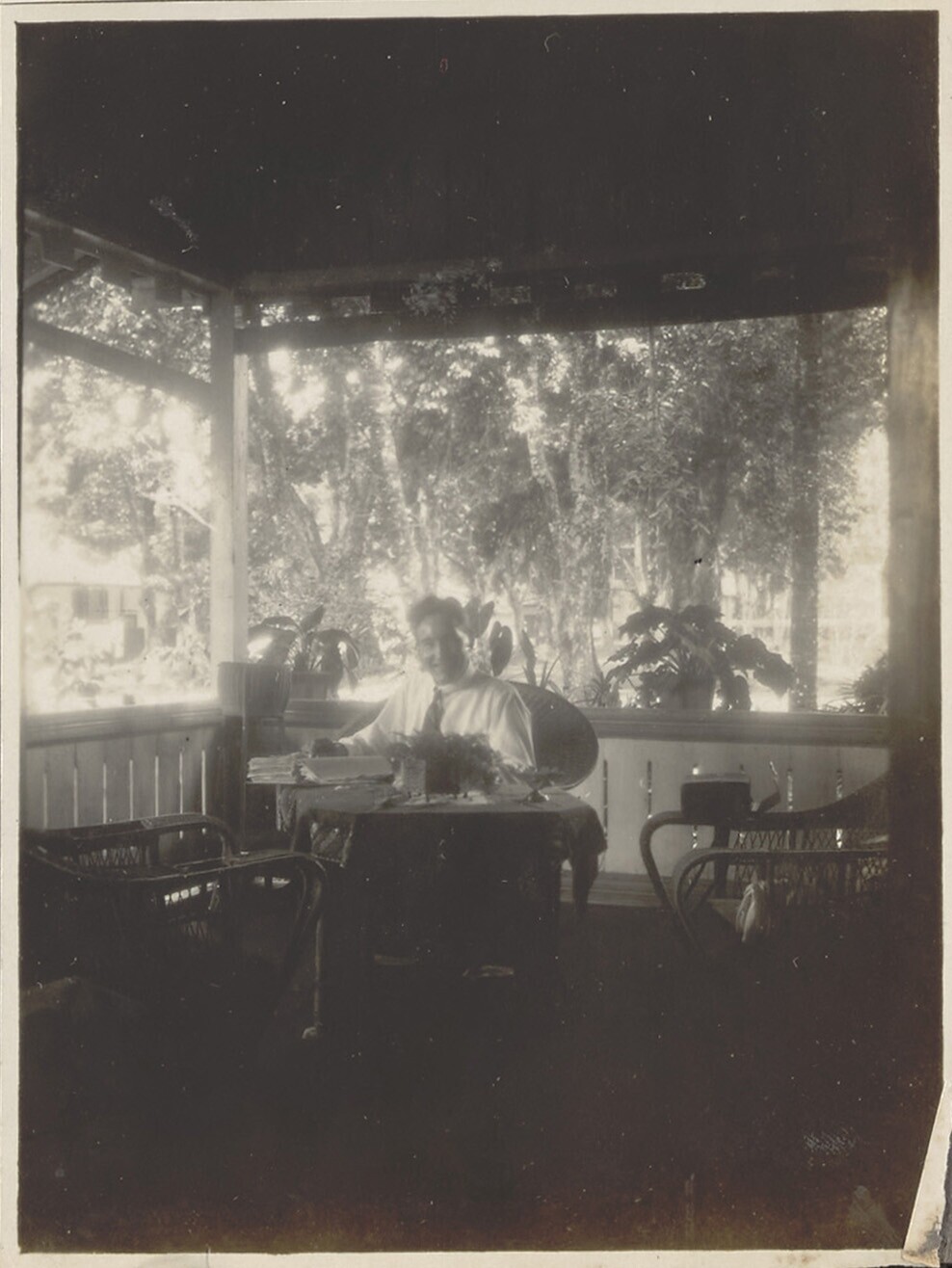 Portret van een man die in een stoel zit op een veranda van een woning in Indonesië