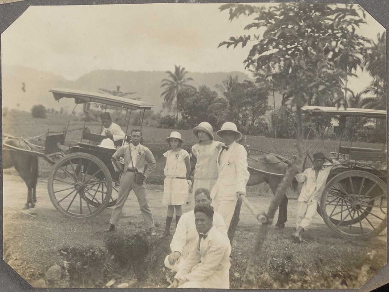 Groepsportret en twee rijtuigen voortgetrokken door paarden