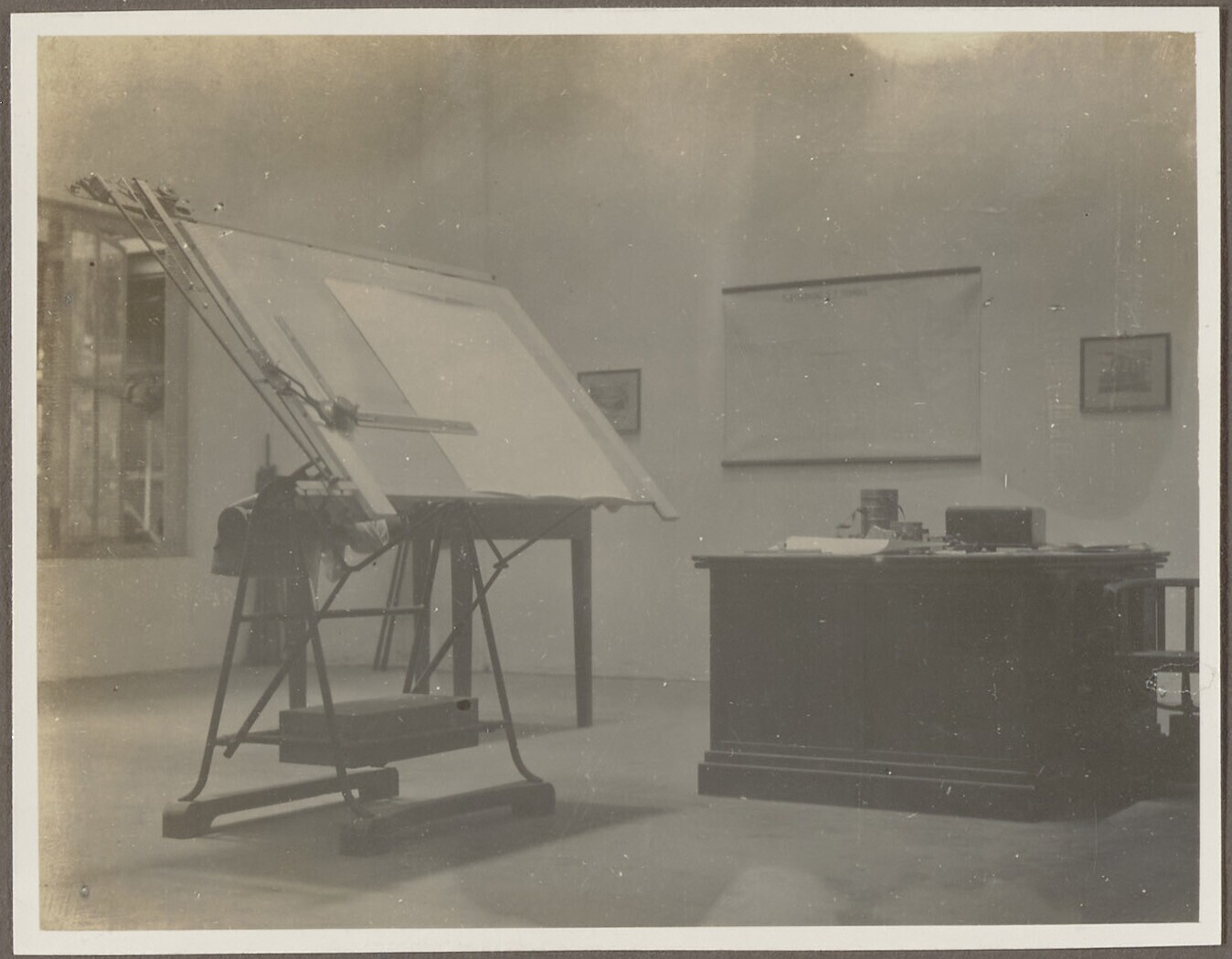 Kantoorruimte met een bureau en een tekentafel in suikerfabriek Trangkil