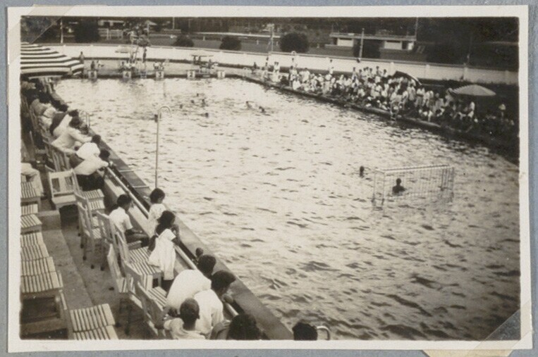 Zwembad met zwemmers tijdens Nederlands-Indische zwemkampioenschappen in Malang