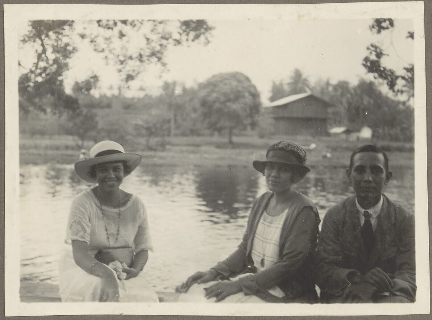Twee vrouwen en een man poseren bij de waterkant