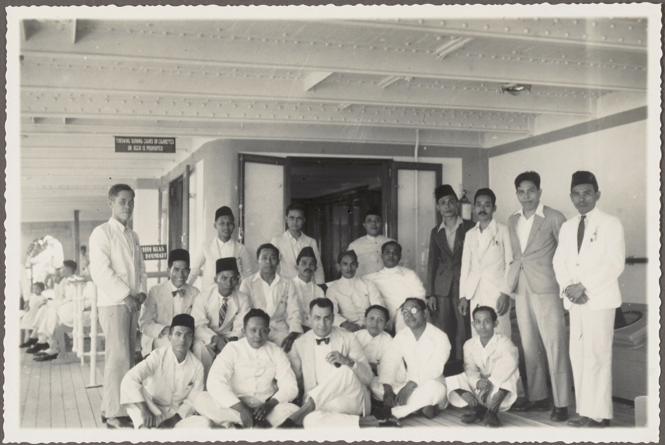 Gezelschap aan boord van het schip Op ten Noort in de haven van Belawan