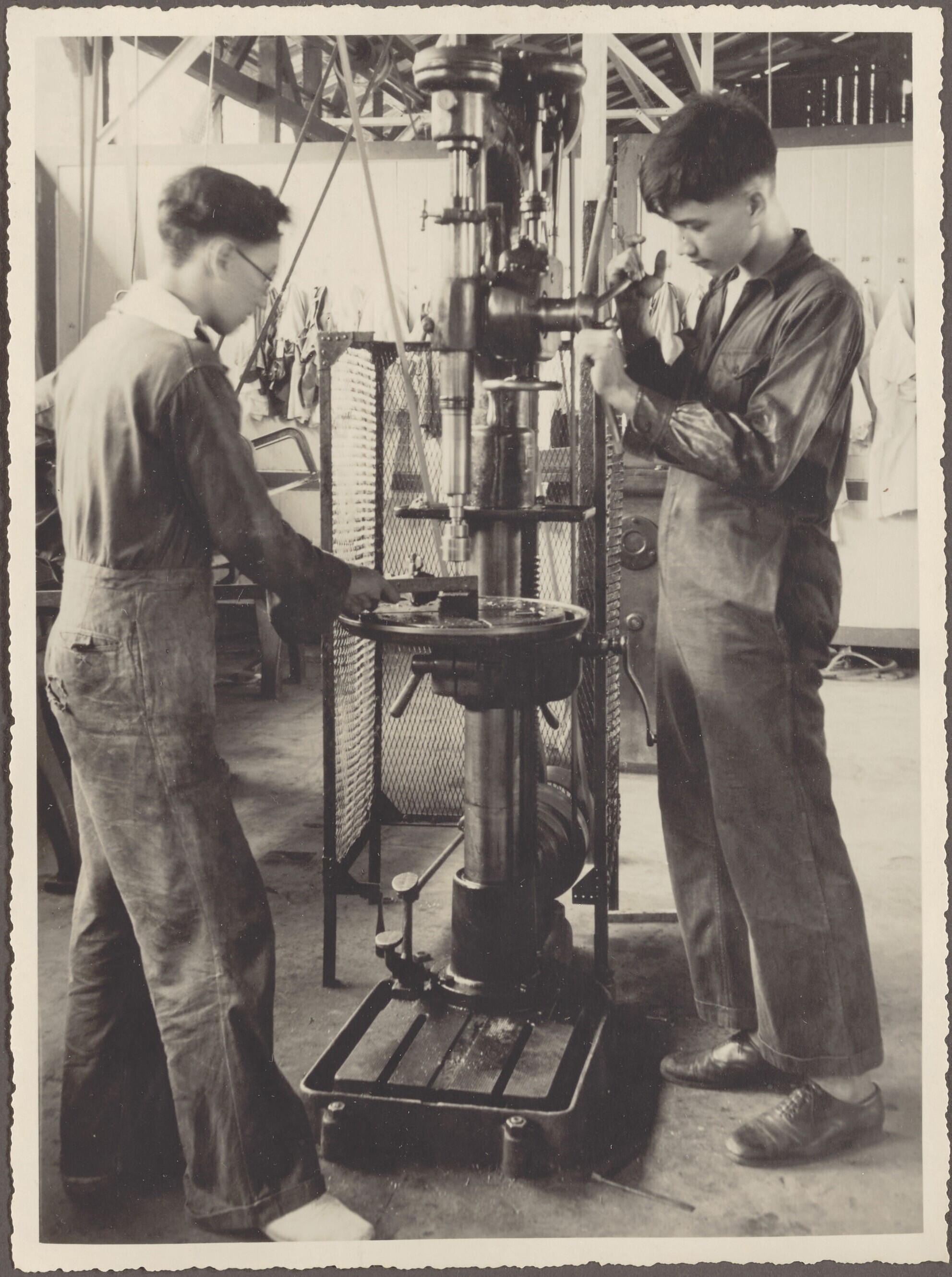 Leerlingen aan een boormachine in openbare ambachtsschool in Medan