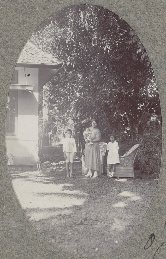 Moeder poseert met haar kroost in de achtertuin