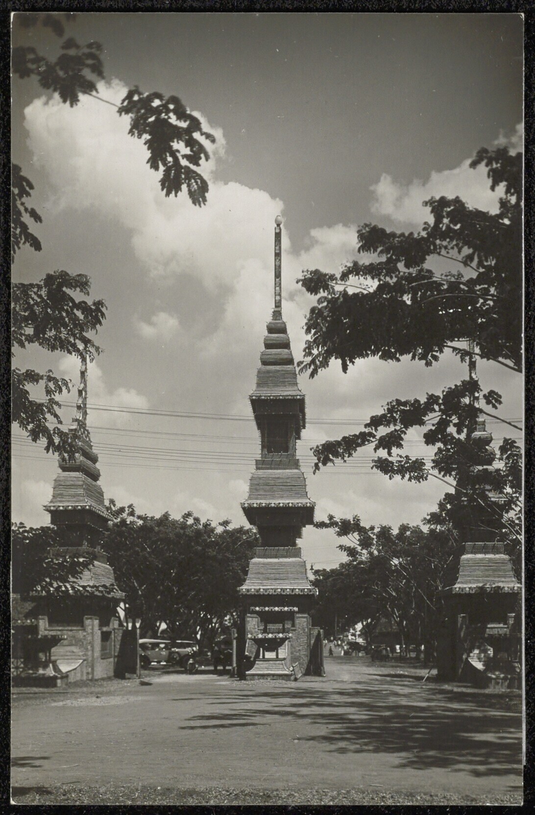 Hoofdingang van de Pasar Gambir jaarmarkt op het Koningsplein in Batavia