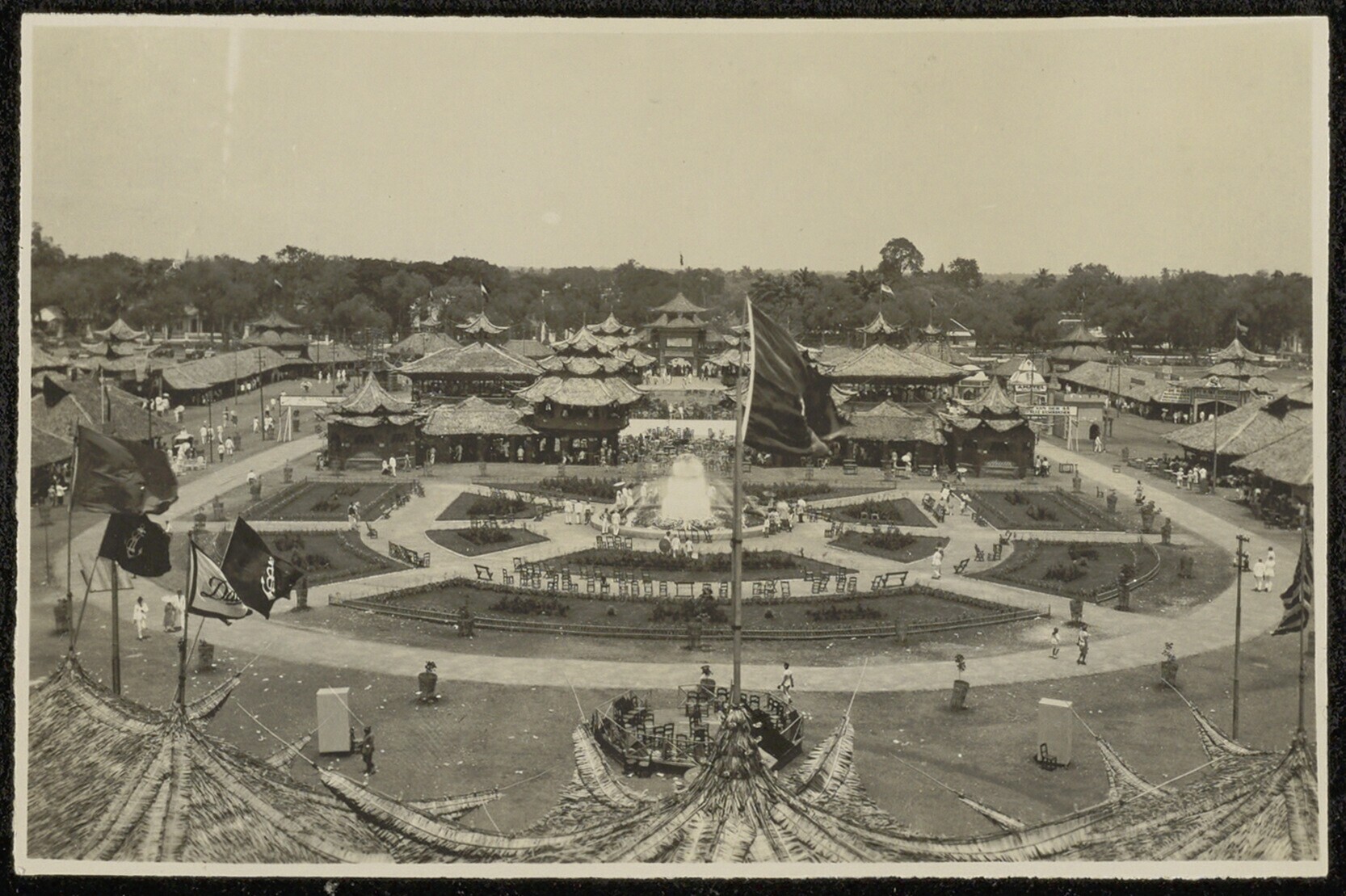 Gezicht op de paviljoens van de Pasar Gambir jaarmarkten op het Koningsplein in Batavia