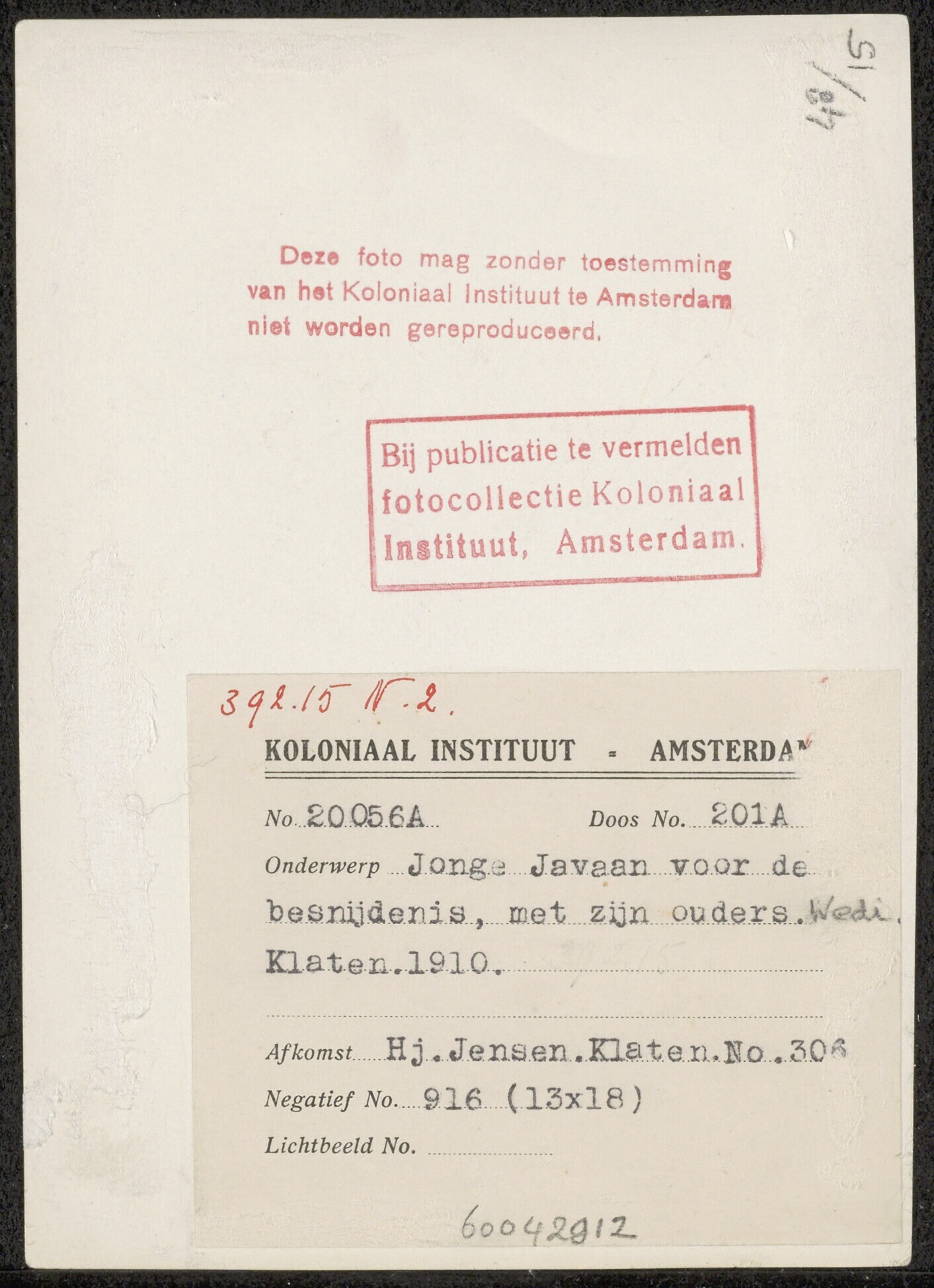 Portret van een jonge Javaan temidden van zijn ouders te Wedi vlak voor zijn besnijdenis, waarbij de jongen een kwast in de hand heeft die dient voor het afhouden van de vliegen van het gewonde penisdeel na de besnijdenis (?)
