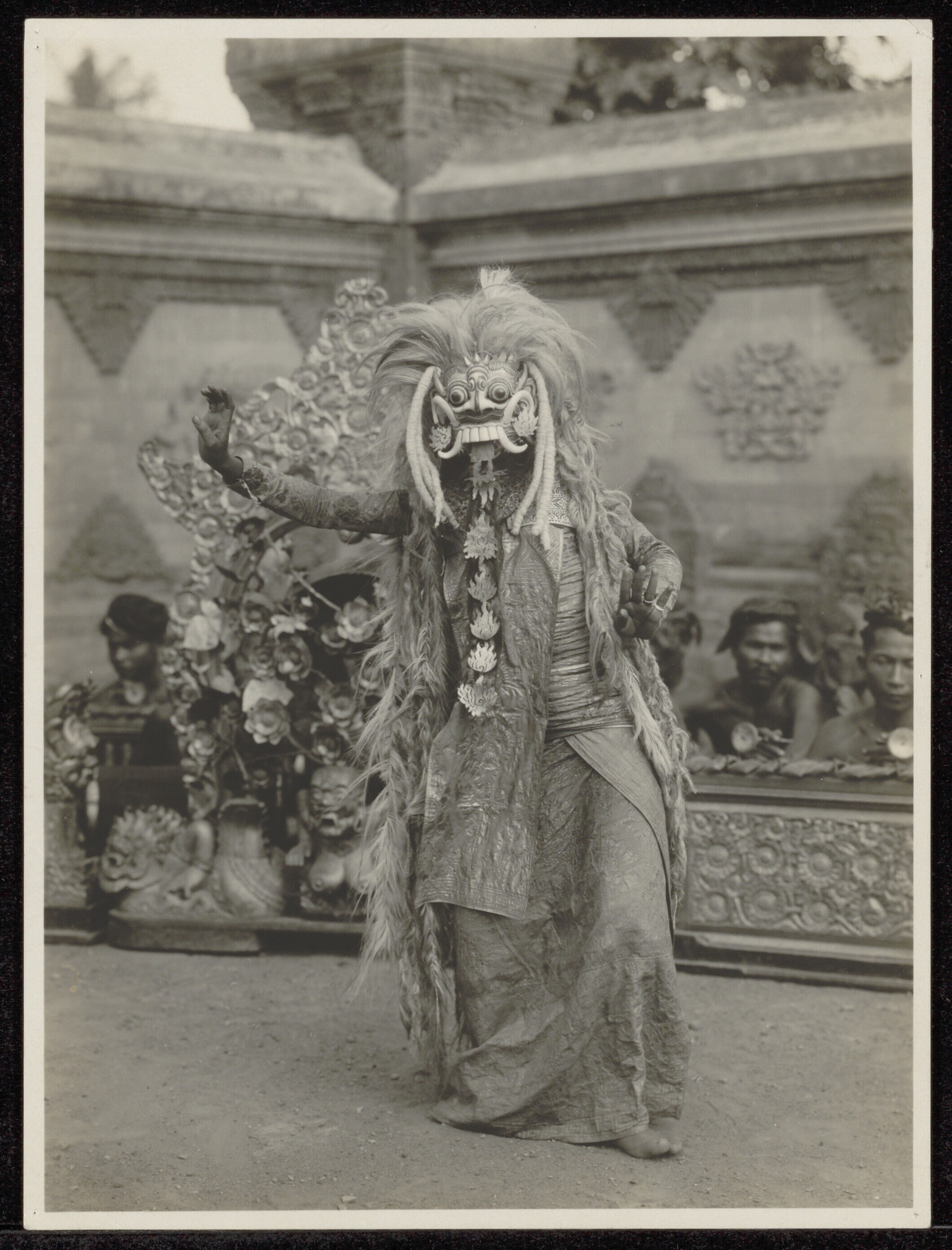 Een Balinese danseres met een masker van Rangda, de heksweduwe, tijdens een Calon Arang dansvoorstelling met gamelanorkest