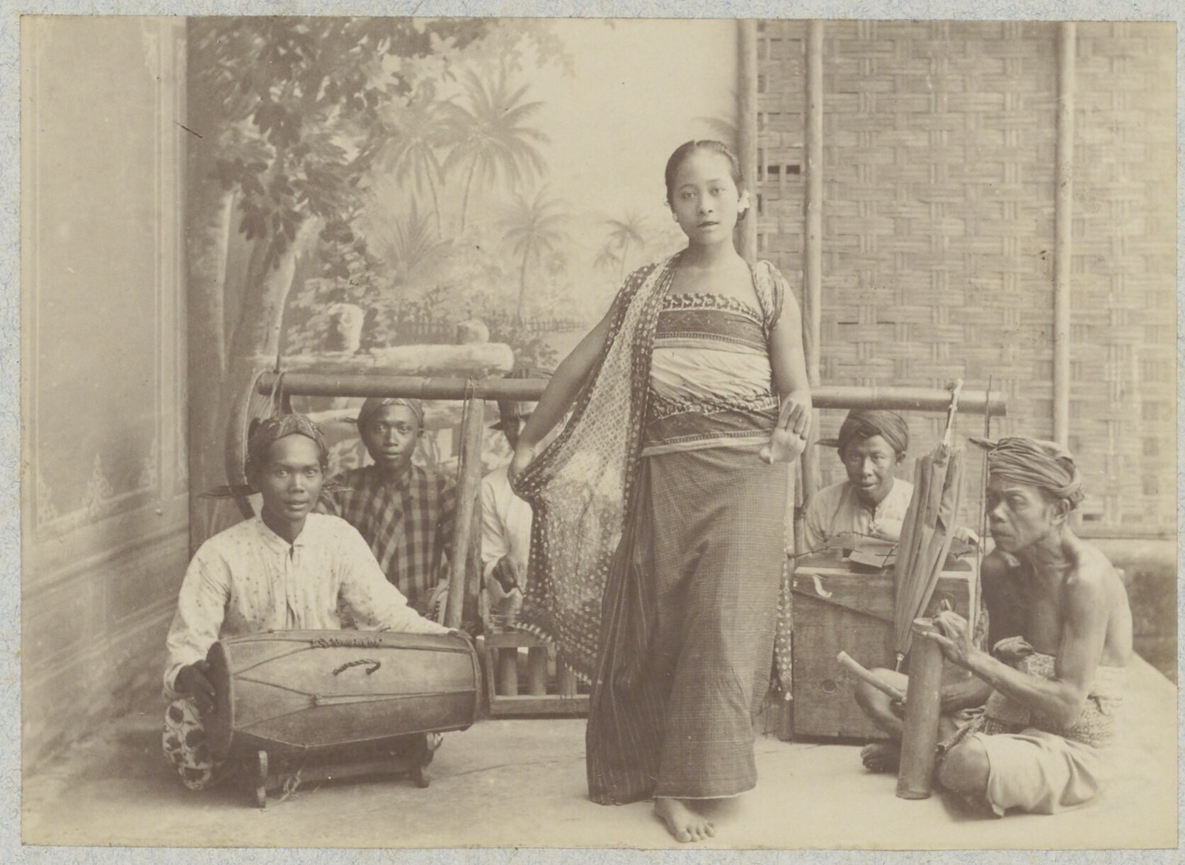 Studio portrait of a ronggeng dancer accompanied by musicians