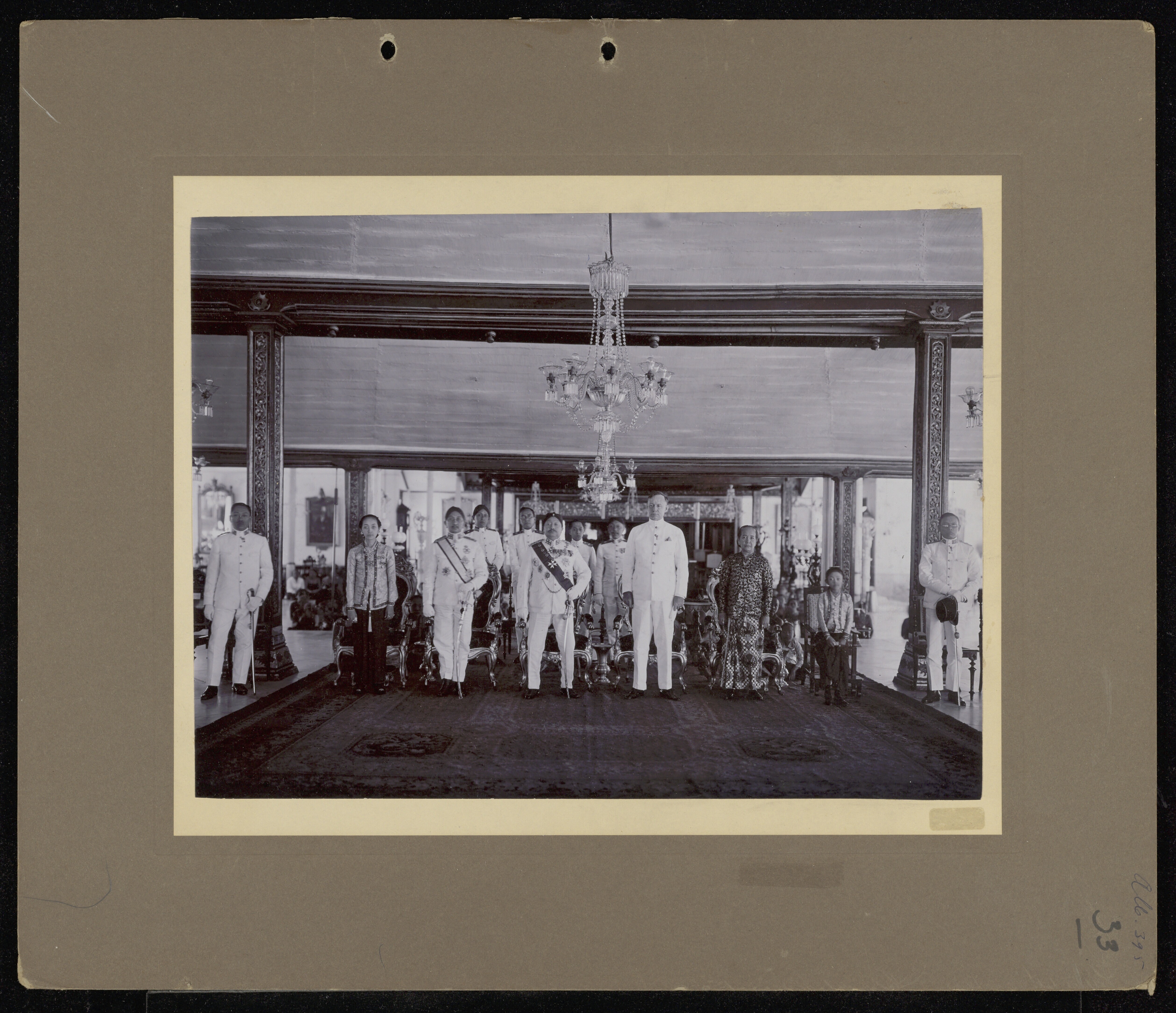 Groepsportret met Sultan Hamengku Buwono VIII en Pangeran Adipati Pakoe Alam VII van Jogjakarta, Susuhunan Pakoe Buwono X, Mangkoe Negoro VII en M.B. van der Jagt, gouverneur van Soerakarta, in de kraton van de Susuhunan te Solo