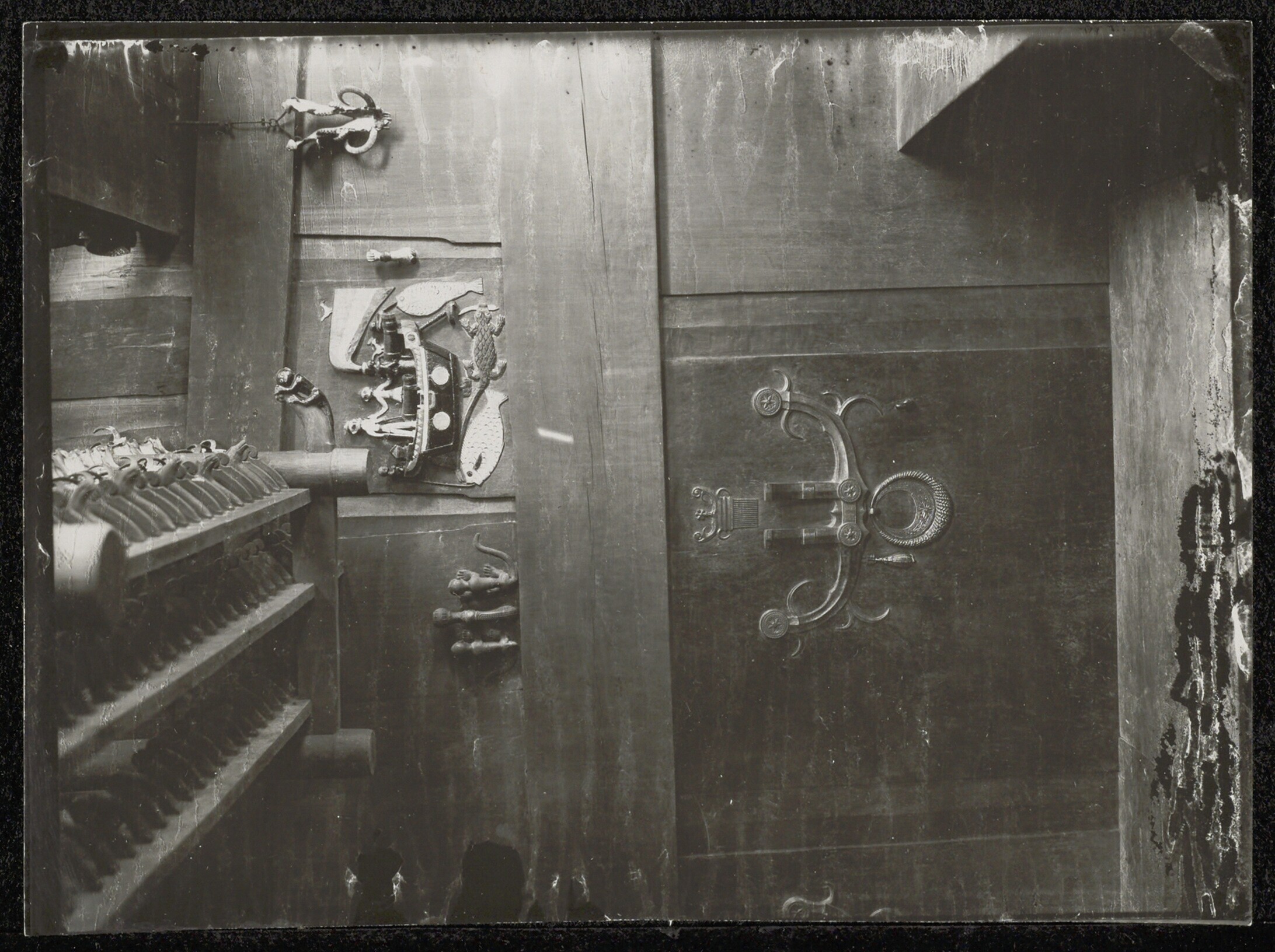 Houtsnijwerk van Europese boot met kanon langs de muur van een adathuis in Bawomataloewo
