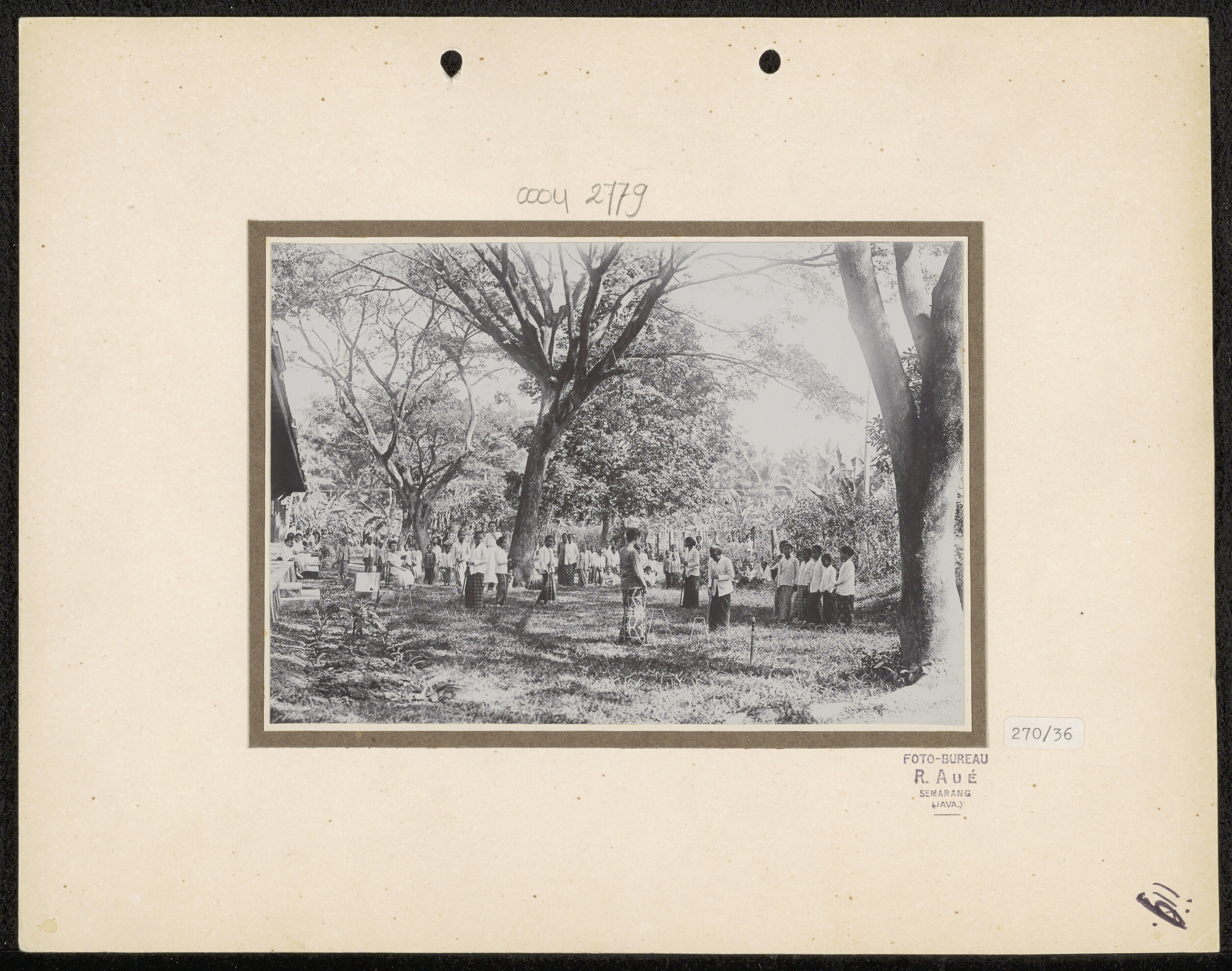 Javaanse kinderen spelen onder het toeziend oog van Europese onderwijzeressen (?) een spel crocket in een tuin te Semarang (?)