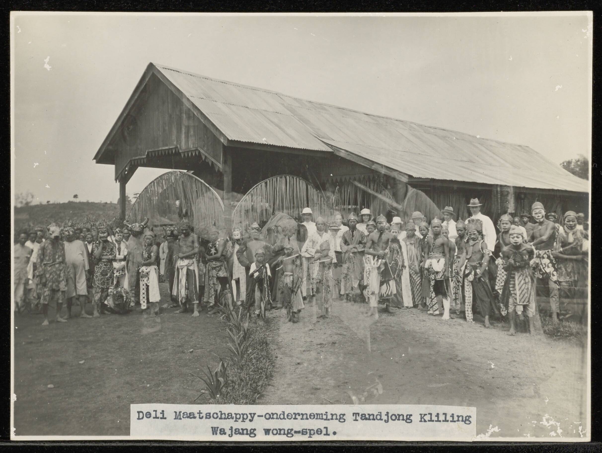 Groepsportret tijdens een wajang voorstelling op de onderneming Tandjong Kleling van de Deli Maatschappij