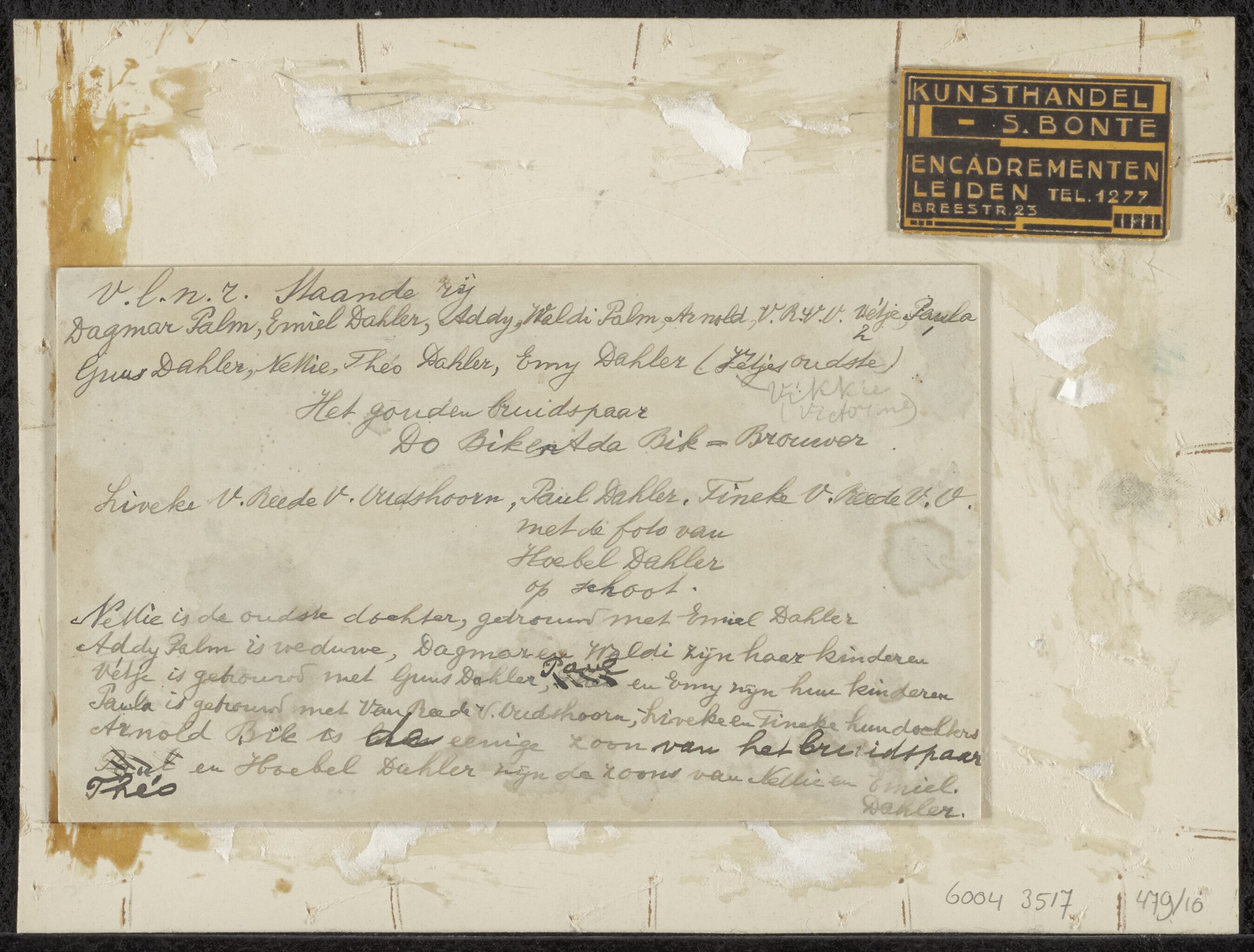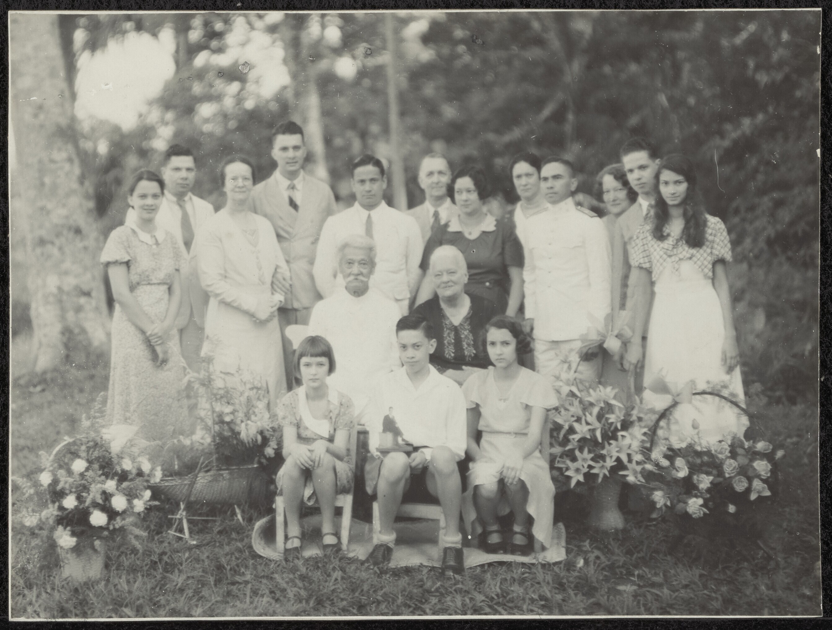 Portret van de Indo-Europese familie Bik-Brouwer tijdens het gouden huwelijksfeest van de ouders