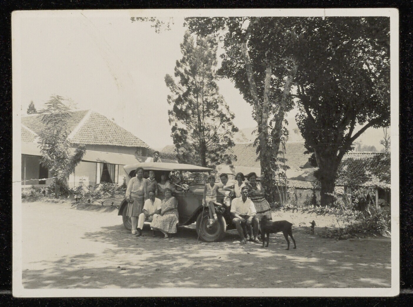 Een groep mensen poseert bij een auto op het erf bij een kleine villa