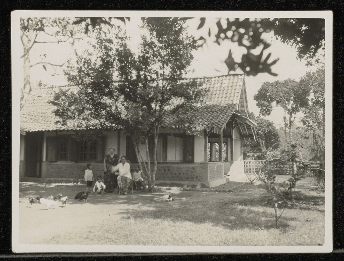 Een gezelschap in de tuin bij een kleine villa, op het gras worden kippen gevoerd