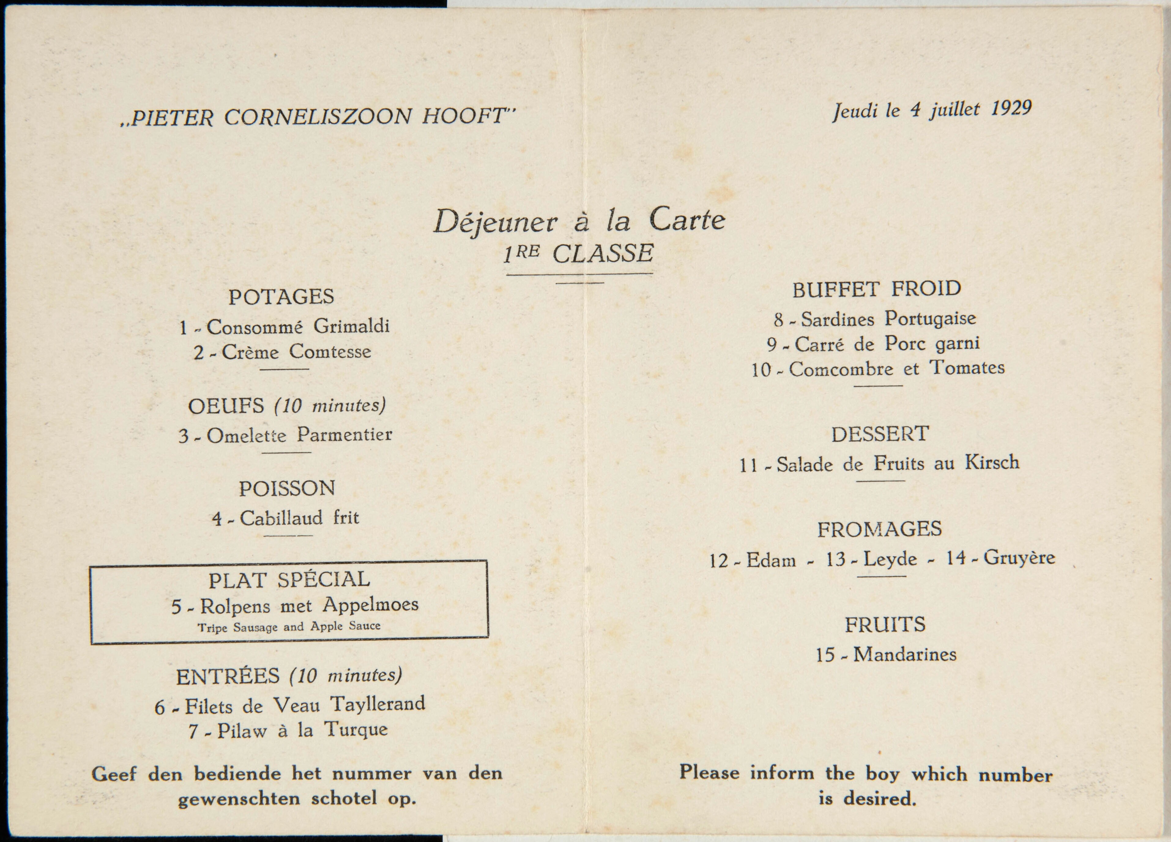 Menukaart voor de 1ste klasse passagiers van het MS. P.C. Hooft van de Nederlandse stoomvaartmaatschappij.