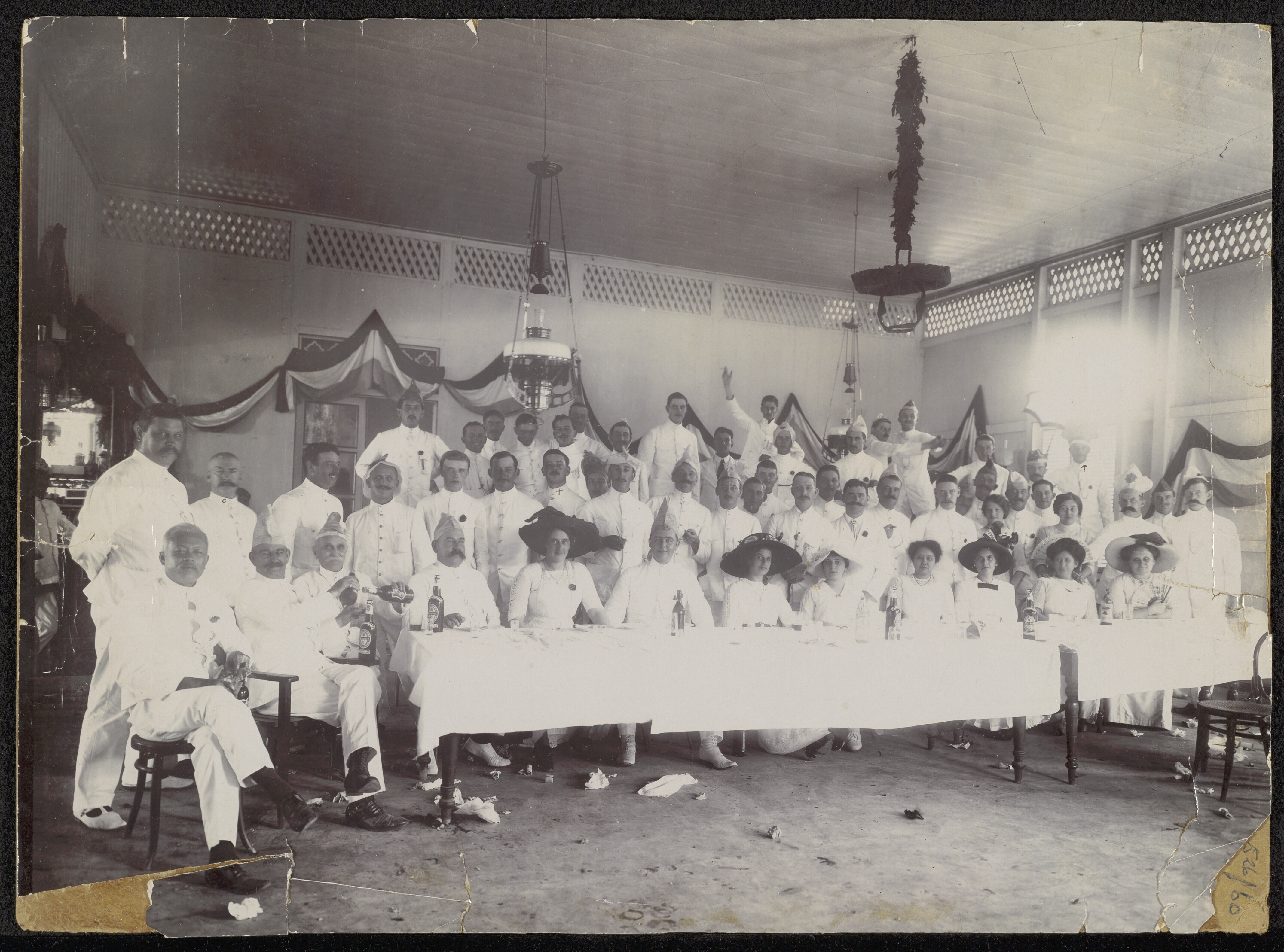 Groepsportret tijdens een feestelijke aangelegenheid, Nederlands-Indië