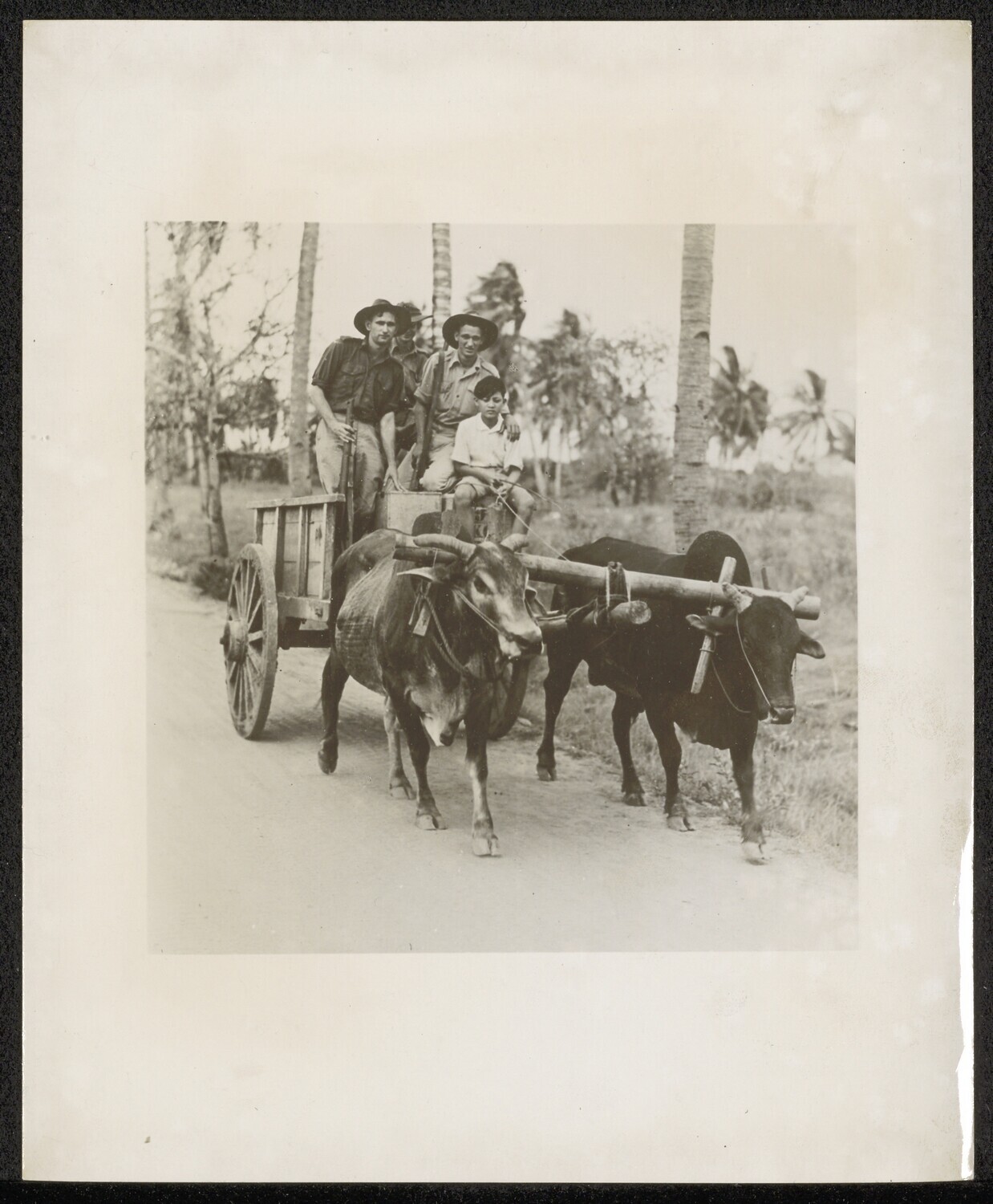 Drie Australische militairen krijgen een lift met een ossenkar tijdens de bevrijding van Nieuw-Guinea