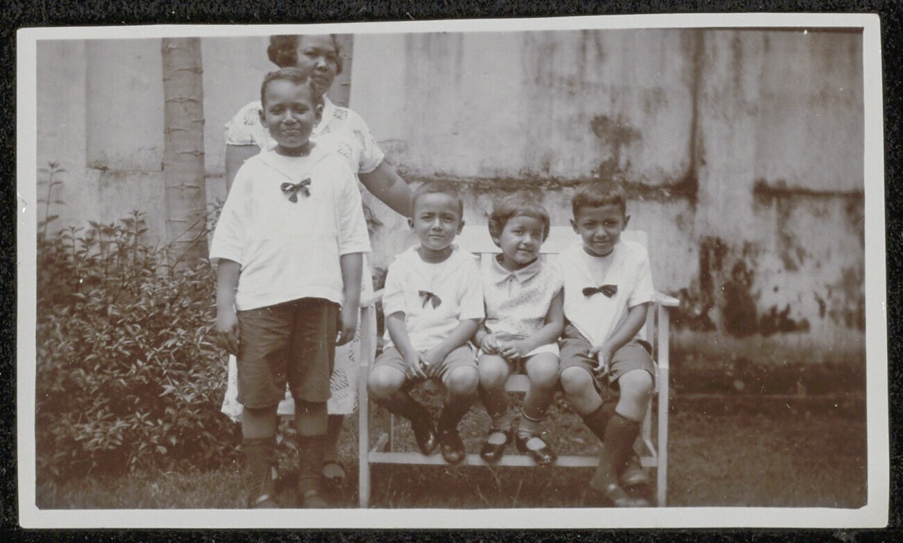 Groepsportret van een vrouw en vier kinderen, waarvan drie zittend op een bank