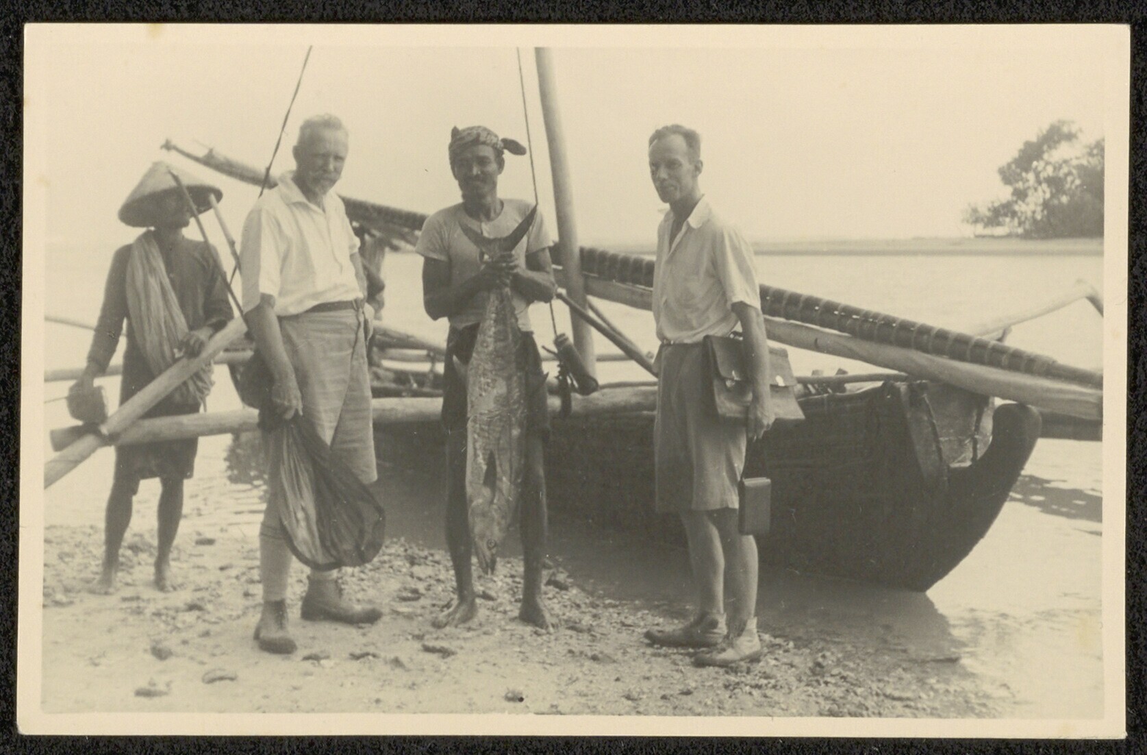 Mannen bij aankomst op het strand van Moearabinoeangeun, na een verblijf op Trouwers-eiland (Poelau Tindjil), met een op zee gevangen tengiri