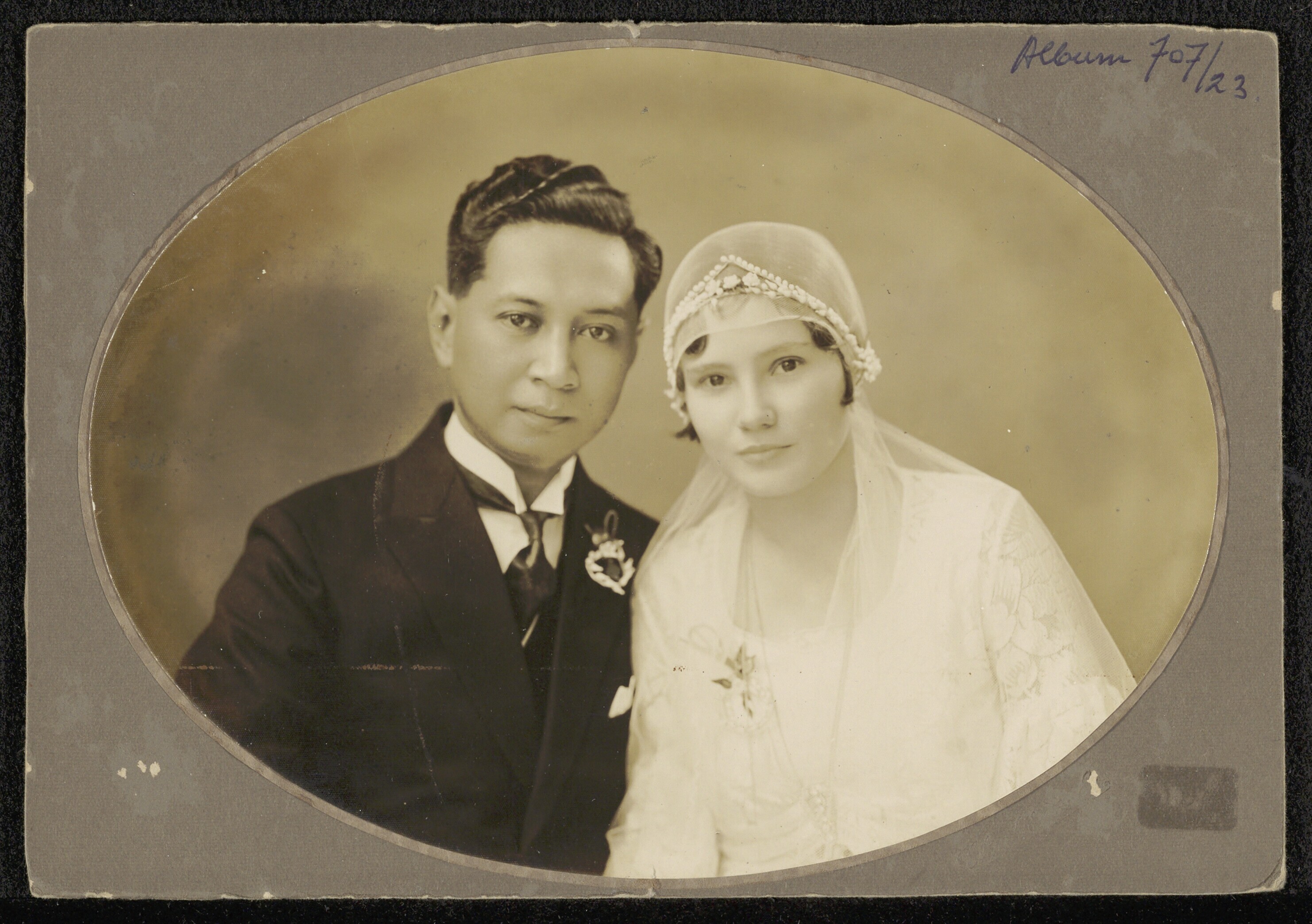 Bruidsportret van een Indische man en vrouw in bruidskleding
