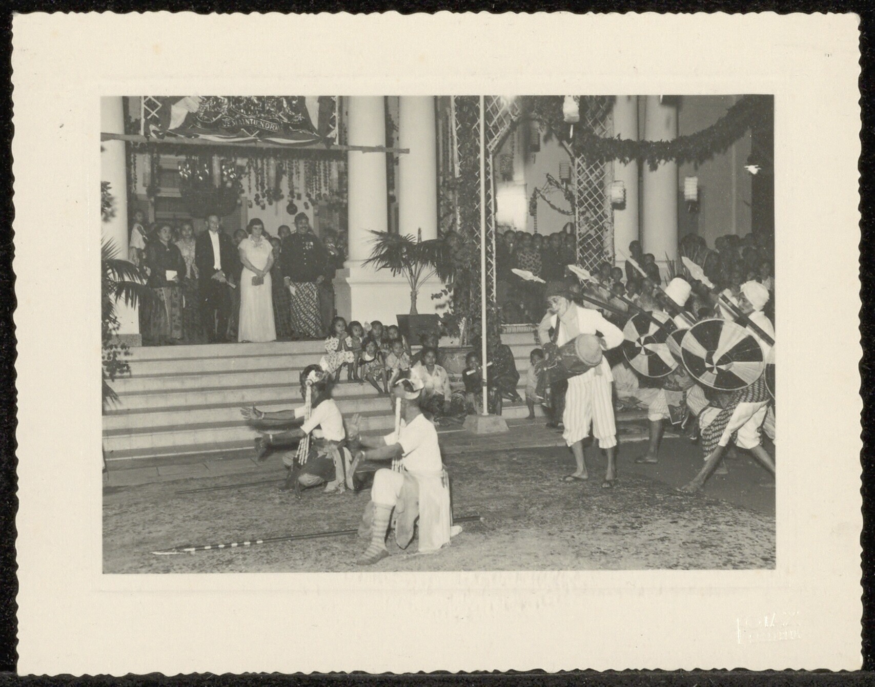 De Susuhunan van Surakarta met Europees echtpaar kijkt vanaf het bordes naar een dansvoorstelling op het erf