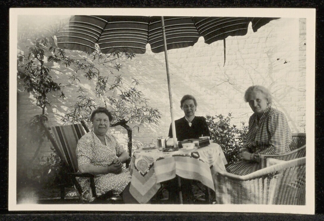 Portret van drie oudere vrouwen die in een tuin zitten