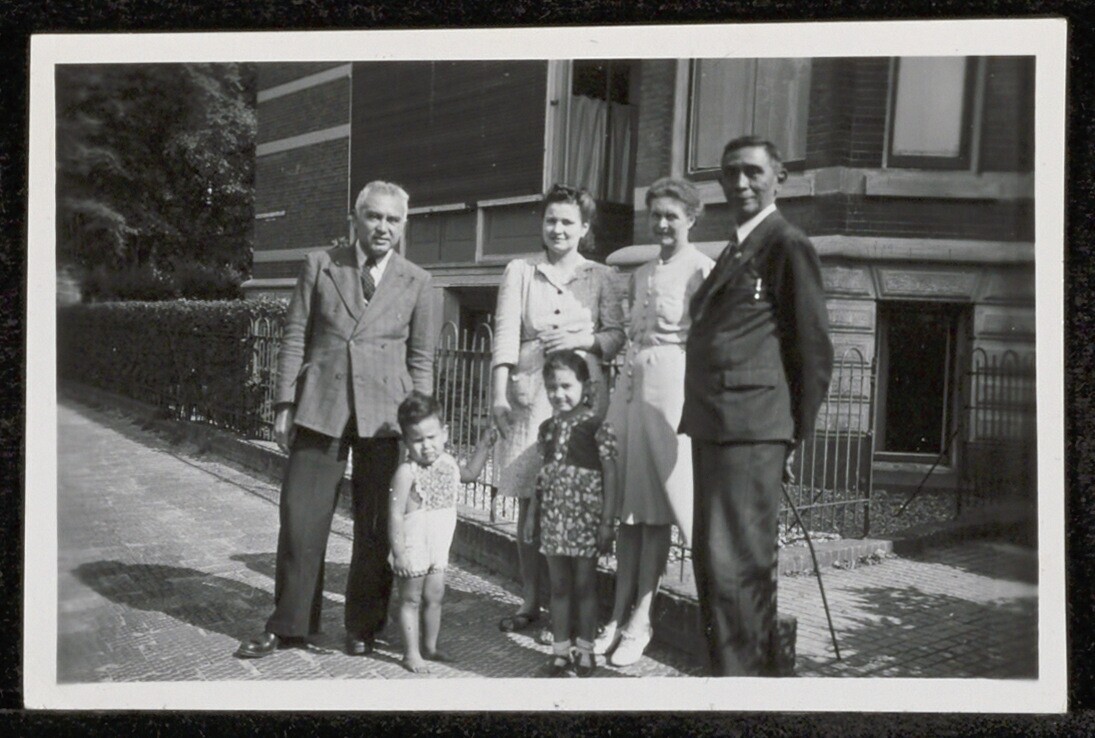 Portret van Heer Cramer, zijn schoondochter en haar twee kinderen voor een woning in scheveningen
