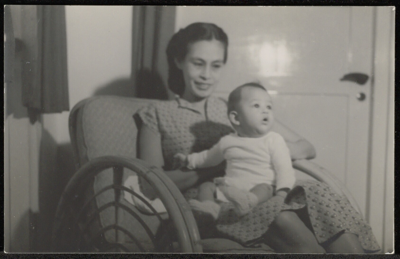 Portret van vrouw en kind in een stoel in de woonkamer