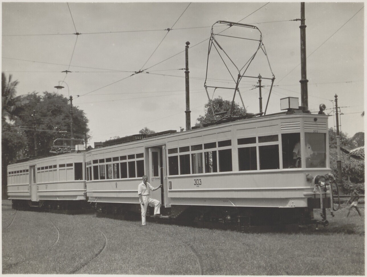 Een man poseert naast de nieuwe tram