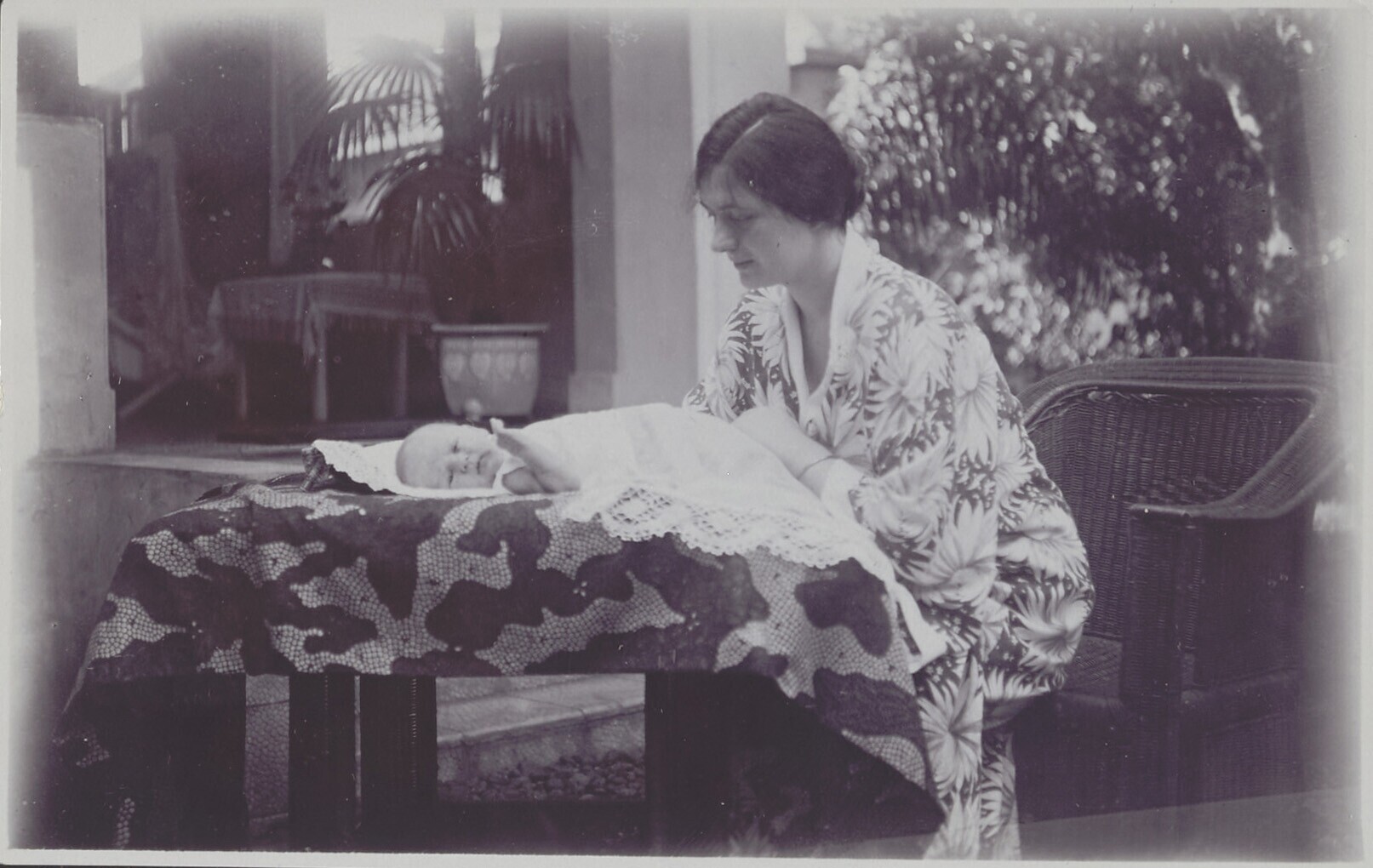 Portret van een jonge moeder en haar pasgeborene in de voorgalerij