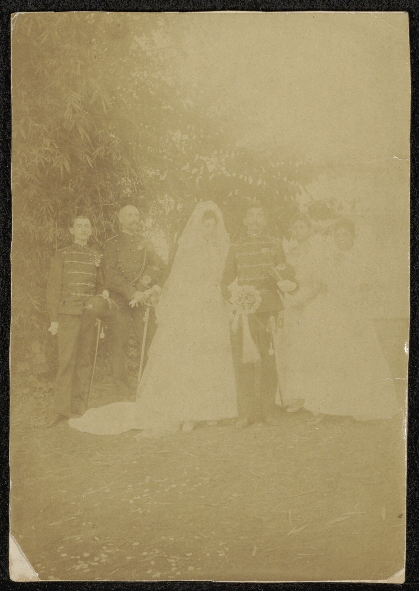 Portret van bruidspaar met gezelschap