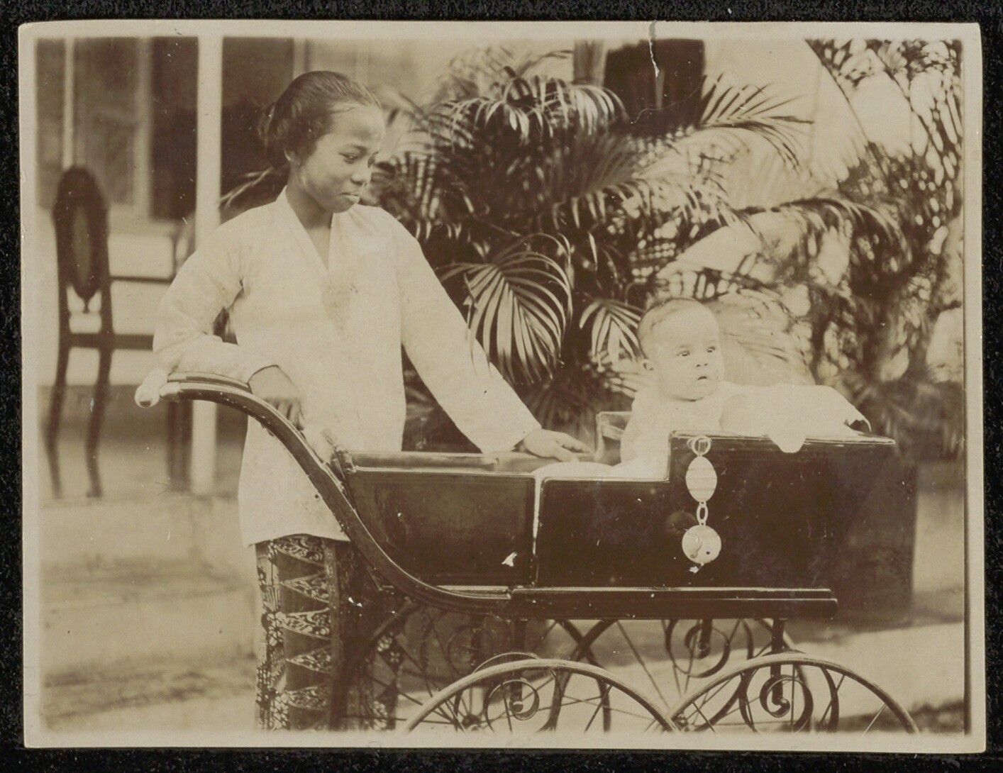 Kinderverzorgster met kind in kinderwagen, op de achtergrond de voorgalerij van een huis