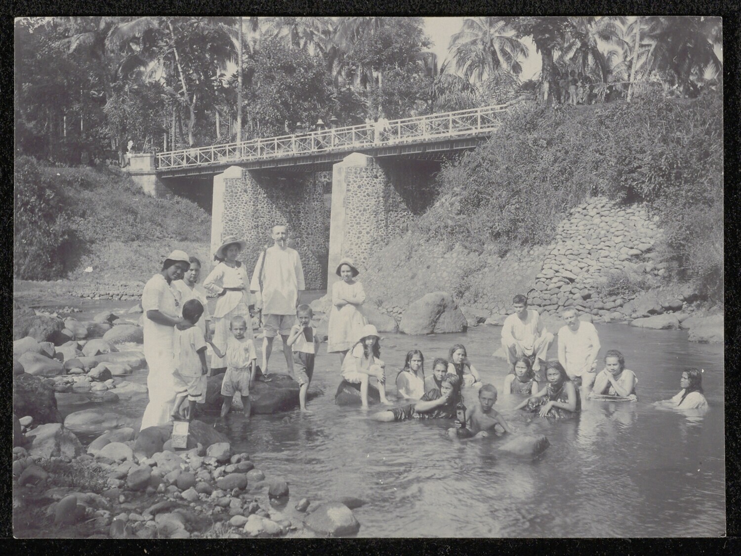 Gezelschap met kinderen bij een rivier, op de achtergrond een brug