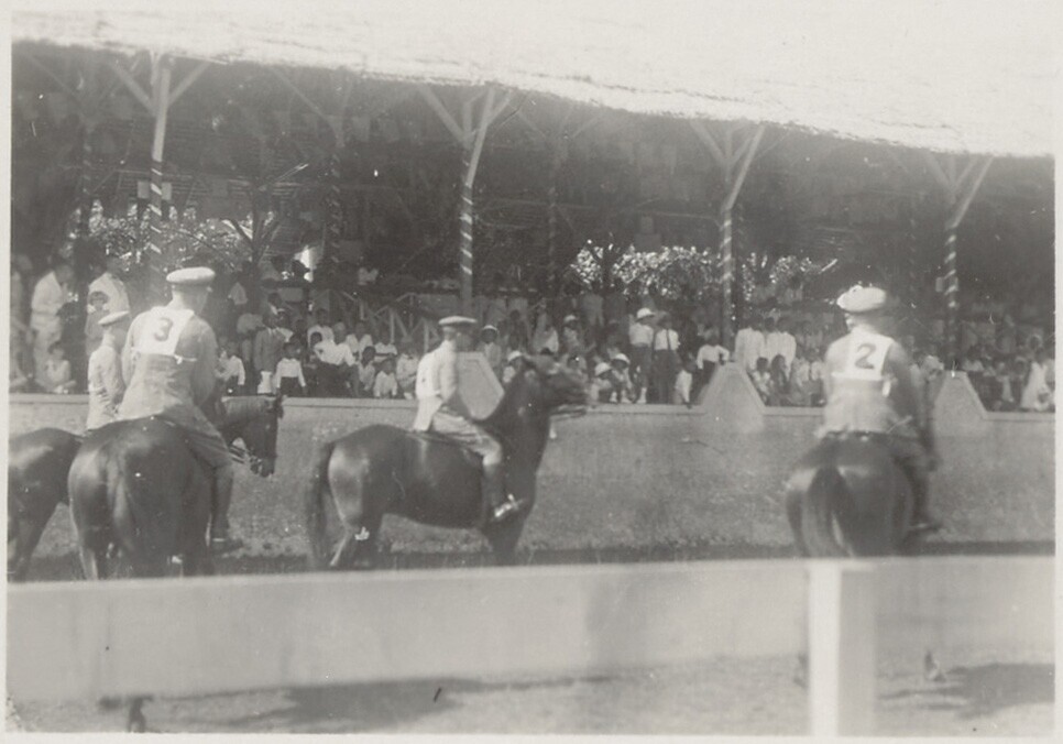 Militairen te paard tijdens paardenraces in Padang Pandjang op West-Sumatra