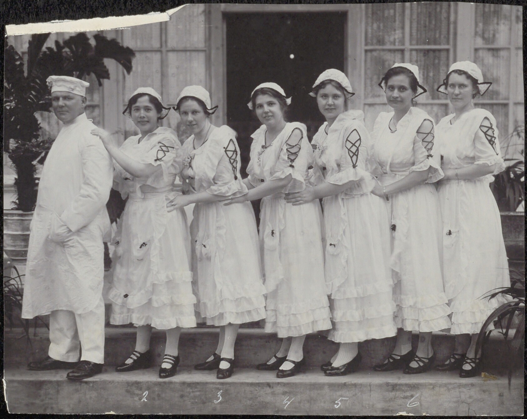 Groepsportret van vrouwen in verkleedkleding en een man ter gelegenheid van Koninginnlag