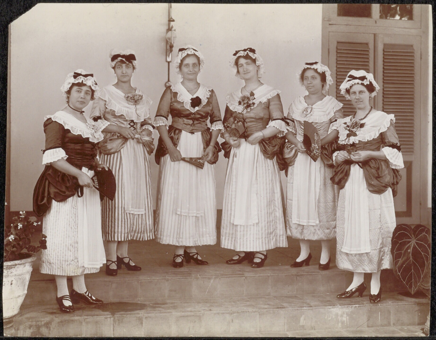Groepsportret van dames in verkleedkleding ter gelegenheid van Koninginnlag