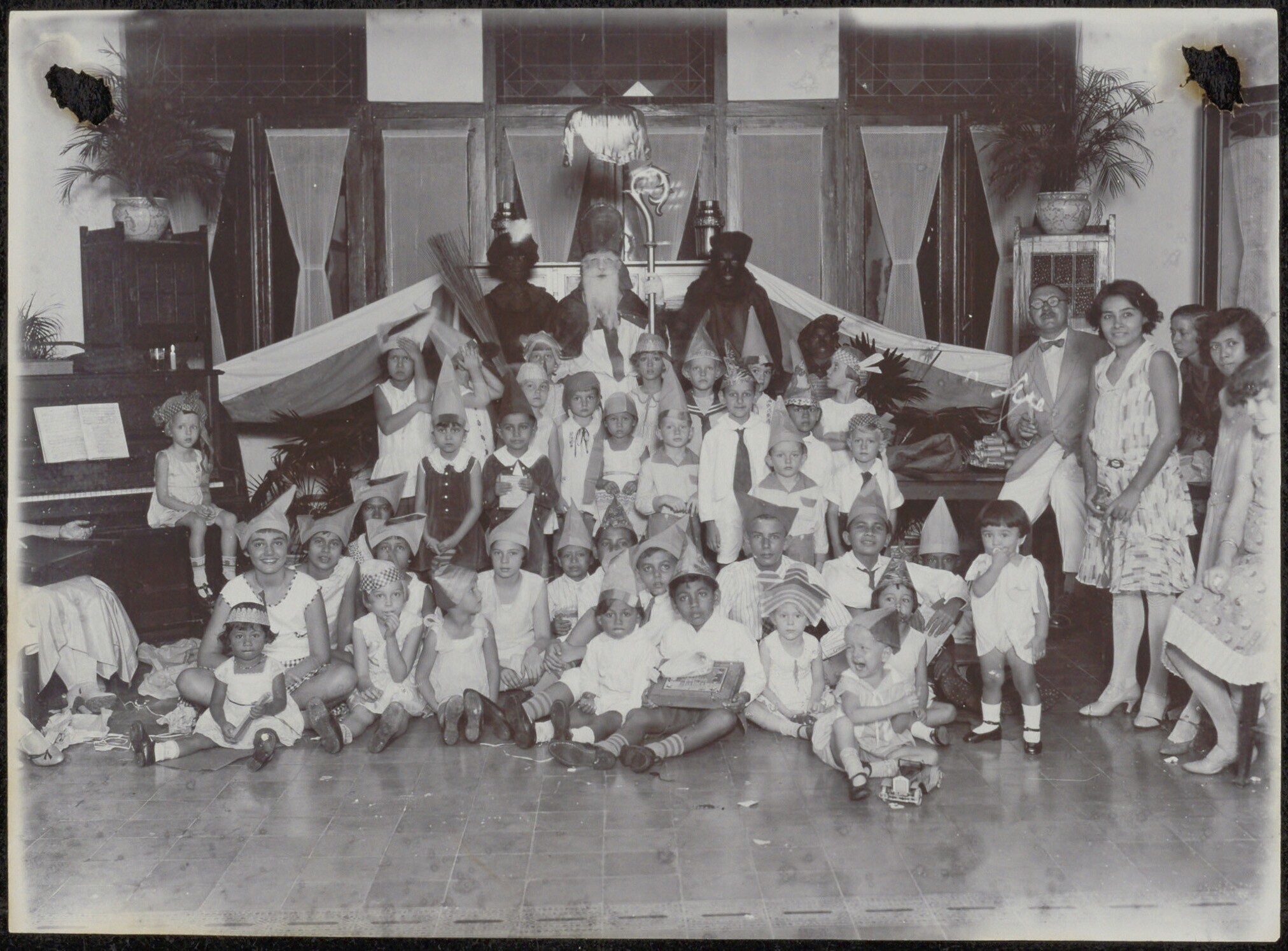 Groepsportret met verklede kinderen, Sinterklaas en Pieten
